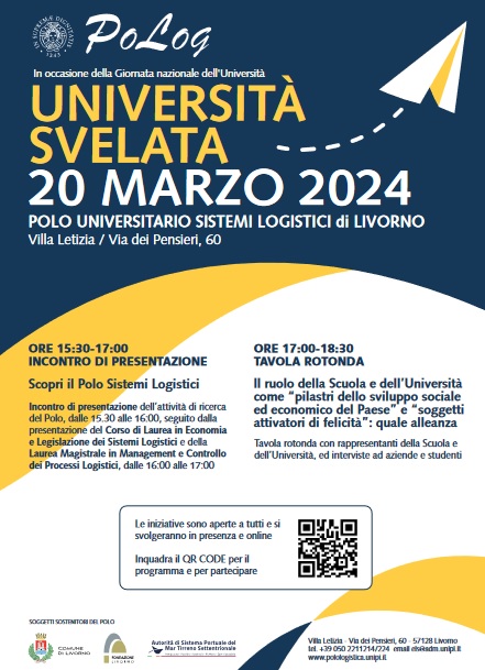 Il 20 marzo, organizzata dal Polo Universitario Sistemi Logistici in via dei Pensieri, si svolgerà l’iniziativa Università Svelata nell’ambito della Giornata Nazionale delle Università istituita quest’anno, per la prima volta, il 20 marzo, in occasione della Giornata Mondiale della Felicità. L’iniziativa, aperta a tutta la cittadinanza, è composta da due attività che si svolgeranno sia in presenza che online (nella locandina che trovate qui in pagina è spiegato come poter partecipare) con il duplice obiettivo di far conoscere l’offerta formativa e l’attività di ricerca del Polo, e di aprire un dialogo, in particolare, con le Scuole Superiori, per costruire una nuova alleanza in funzione di rilevanti obiettivi comuni. Le due attività previste sono: