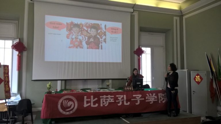 Il benvenuto all’anno del cane e l’addio a quello del gallo è stato dato in mezzo a danze, canti e un’atmosfera festosa. Il tutto nell’aula Magna dell’Itc Vespucci di via Chiarini perpetuando una tradizione che ormai va avanti da quando nella scuola è stato introdotto lo studio curriculare del cinese mandarino nell’indirizzo Relazioni Internazionali per il Marketing, quella cioè di festeggiare il Capodanno cinese. Con un leggero anticipo rispetto al 15 febbraio, data che segnerà il passaggio dall’anno del gallo a quello del cane in Cina, l’istituto Vespucci ha organizzato una mattinata di festa, all’insegna della cultura, delle tradizioni e della lingua cinese. Gli studenti della classe quinta hanno infatti eseguito una canzone in lingua cinese, che spiegava la difficoltà che un parlante di altre lingue può incontrare nello studio del mandarino, per il quale il tono del vocabolo decreta anche il suo significato; alcuni alunni della classe quarta si sono cimentati in scioglilingua in cinese, mentre gli alunni delle terze (da questo anno, infatti, sono raddoppiati gli iscritti al corso RIM, per cui le terze sono diventate due) hanno condotto i laboratori di intaglio. Per realizzare tipiche decorazioni a forma di animali o di lanterne che vengono usate nelle case o nei negozi nel periodo festivo intorno al Capodanno o per dipingere le maschere dei personaggi dell’Opera di Pechino.