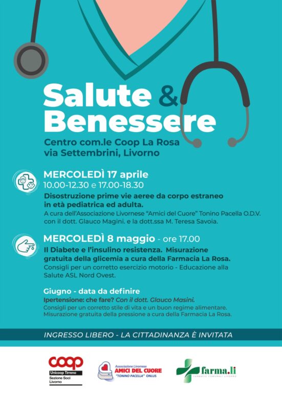 Un boccone che va di traverso, un oggetto ingoiato da un bambino possono mettere a rischio la vita. Ci sono manovre semplici, che ognuno può effettuare, e che agevolano la fuoriuscita di quello che impedisce la respirazione e possono salvare la vita. Occorre però sapere che cosa fare e proprio per divulgare queste semplici regole il prossimo mercoledì 17 aprile al Centro commerciale La Rosa si terrà una giornata dedicata alla disostruzione delle vie respiratorie. I medici dell’Associazione Livornese Amici del Cuore saranno a disposizione per insegnare a tutti coloro che vorranno partecipare quali sono le cose da fare e come agire in caso di emergenza di questo tipo. La giornata è stata organizzata dalla Farmacia La Rosa e si inserisce in un calendario di tre incontri che hanno per tema la salute dei cittadini. I temi che saranno trattati sono: Disostruzione delle prime vie aeree da corpo estraneo in età pediatrica e adulta che si terrà il prossimo 17 aprile, Il diabete e l’insulino resistenza con misurazione gratuita della glicemia che si svolgerà l’8 maggio ed infine nel mese di giugno in data da definirsi si parlerà di Ipertensione. L’Associazione Livornese Amici del Cuore, attiva in città da venticinque anni, è impegnata, tra l’altro, nella divulgazione  di quanto occorre fare per cercare di salvare una vita in caso di arresto cardiaco con l’uso del defibrillatore e di come agire in caso di ostruzione delle vie respiratorie. La partecipazione all’evento è libera e gratuita. I medici saranno presenti dalle 10 alle 12,30 e nel pomeriggio dalle 16 alle 18,30.
