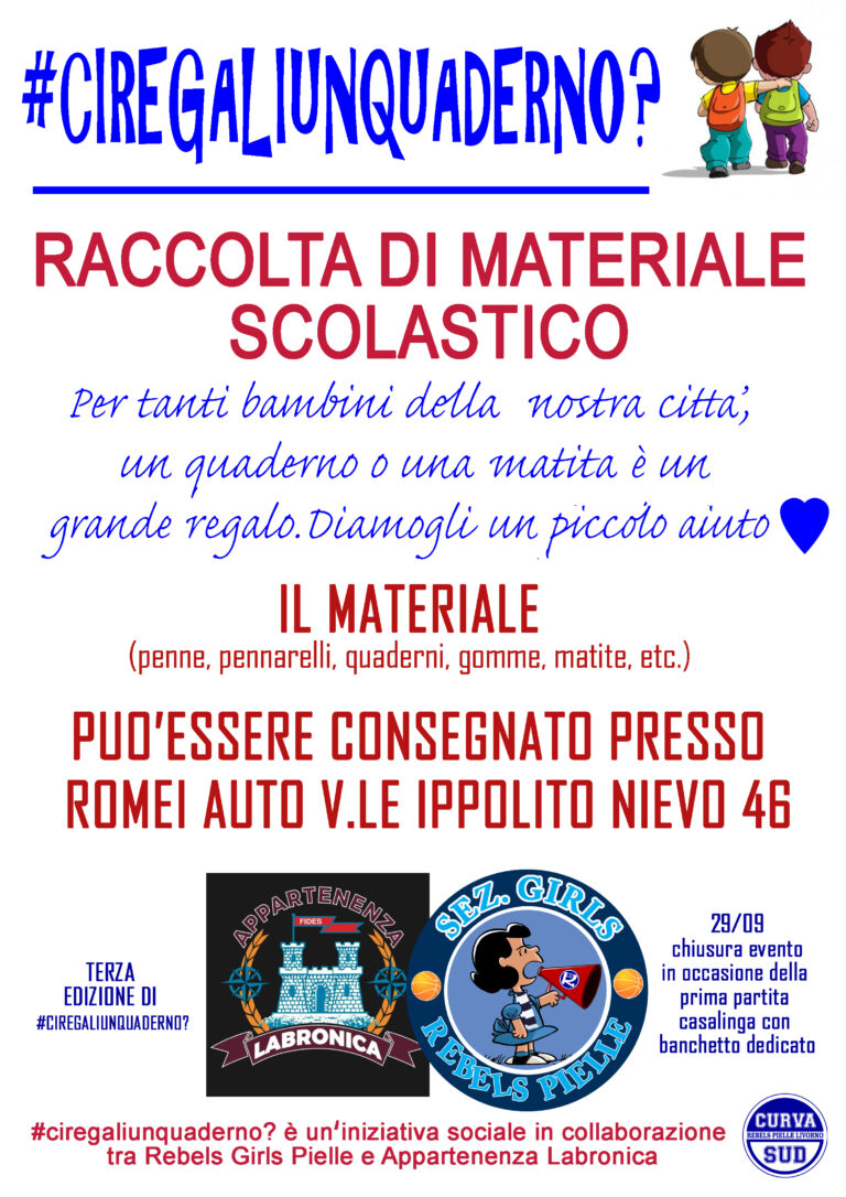 La raccolta si concluderà domenica, con un banchetto per la raccolta finale, all’ingresso del PalaMacchia in occasione della prima partita casalinga di serie B tra Toscana Legno Pielle e Sant’Antimo. Si potrà consegnare il materiale sino a sabato mattina, compreso, da Romei Auto in viale Ippolito Nievo 46 dove troverete all’ingresso un contenitore dedicato. L’iniziativa delle Rebels Girls Pielle è destinata alla raccolta di materiale scolastico (penne, quaderni, pennarelli, matite) da indirizzare ai bambini della nostra città che hanno bisogno di un piccolo aiuto per affrontare l’anno scolastico venturo. Potrete portare il vostro contributo (basta veramente anche un quaderno). Il materiale raccolto verrà consegnato ad Appartenenza Labronica che si occuperà della distribuzione.