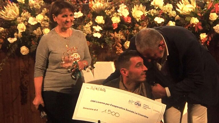 L'assegno è stato consegnato dal presidente e dal coordinatore sindacale di Cna, Serini e Longobardi, a Francesco Archibusacci, uno dei giovani che lavorano a Wonder e ad Alessandra Cirri presidente di Capire un'H e vicepresidente della cooperativa sociale Le Livornine