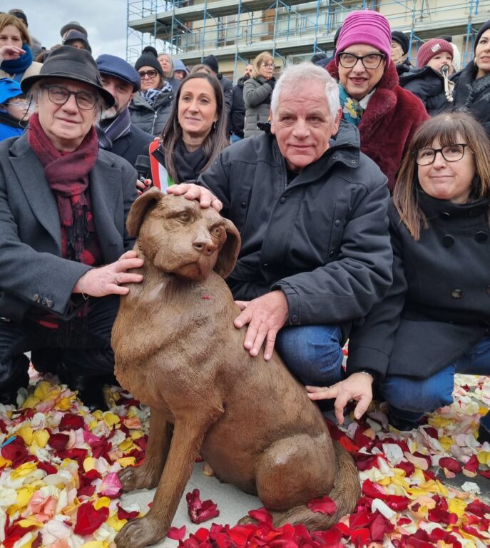 Kyra durante la sua vita è stata un cane soccorritore ed ha partecipato ad una serie di operazioni di protezione civile, oltre ad essere stata protagonista di centinaia di iniziative di solidarietà. In un scuola materna tre volte a settimane per due anni ha giocato con i bambini. Il sabato faceva visita agli anziani di una Rsa cittadina. Andava in giro in tutta Italia per eventi benefici, trascorreva molto tempo con i ragazzi autistici e con bambini malati. Proprio per questo Mario Bartoli ha chiesto all’Amministrazione Comunale di collocare la statua in un parco giochi per bambini, affinché simbolicamente possa continuare a far sorridere i più piccoli. La statua è l’espressione di come attraverso amore e fedeltà la figura del cane può essere di fondamentale aiuto nella vita dell’uomo. E spero molto che in futuro sia meta di scolaresche affinché possano venire a conoscenza di una storia che esprime dei valori che sono le basi della loro crescita. Kyra era una trovatella che entra piccolissima nella vita sconvolta di Mario per la perdita del proprio figlio Christian. Da subito, nasce fra i due un legame che nel tempo diventerà indissolubile. Con molto sacrificio Kyra riesce ad ottenere il brevetto di cane da soccorso della Protezione Civile, ruolo in cui partecipa a diversi interventi di soccorso. Con il tempo vivendoci in simbiosi, Mario si rende conto dell’estrema docilità e l’infinita pazienza che ha verso i bambini e le persone più fragili. Allora decide di usare queste qualità in un percorso affascinante: la pet therapy. In questo impegno, per Kyra e Mario si apre un nuovo mondo d’amore. Sono innumerevoli le presenze nelle varie scuole materne dove diventa ben presto la beniamina amata da tanti piccoli alunni. La sua storia si diffonde e viene raccontata anche in diverse trasmissioni in TV e riviste a diffusione nazionale dedicano dei servizi. Ma sicuramente l’aspetto socialmente più significativo e più importante del suo impegno è stato quello di aver portato in ogni luogo la storia del figlio di Mario che andando “via” aveva donato la vita. Di conseguenza attraverso la sua storia si amplia l’importanza del nobile gesto della donazione degli organi. Scompare improvvisamente, ma la sua scomparsa non ferma il suo percorso d’amore. Infatti, nel suo ricordo ad Antignano viene creato un luogo “magico” dove su migliaia di candide pietre posate nelle acque sono incisi dei nomi sinonimi di amori infiniti.