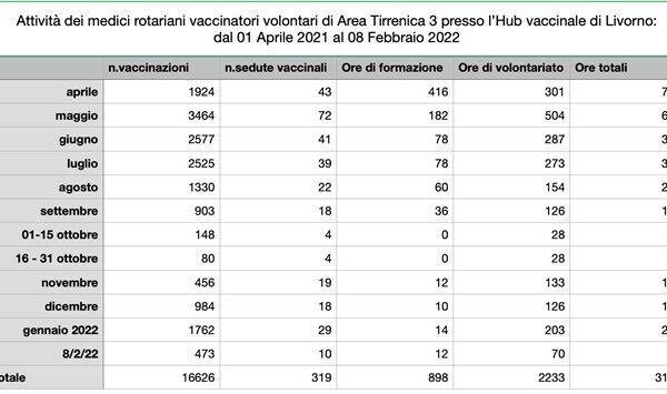 Dal 29 marzo 2021, con l’apertura dell’Hub vaccinale al PalaModì, è partita l’attività dei medici rotariani che, nel febbraio di un anno fa, hanno risposto, insieme ad altri 7 medici non rotariani, ad un bando pubblico della Azienda USL Toscana Nord Ovest per l’assegnazione di medici vaccinatori volontari.