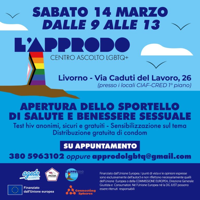 Sabato 14 marzo, dalle ore 9 alle ore 13, al primo piano di via Caduti del Lavoro 26 sarà inaugurato lo sportello di salute e benessere sessuale del Centro Ascolto LGBTQ+ “L’Approdo”. L’iniziativa nasce con l’obiettivo di promuovere informazione, prevenzione e accesso consapevole ai servizi legati alla salute e al benessere sessuale. Durante la mattinata sarà possibile effettuare test HIV anonimi, sicuri e gratuiti, ricevere materiale informativo e partecipare ad attività di sensibilizzazione sui temi della prevenzione. Sarà inoltre prevista la distribuzione gratuita di preservativi. Lo sportello sarà attivo su appuntamento e rappresenta uno spazio di ascolto e supporto dedicato alla comunità LGBTQIA+ e a tutte le persone interessate ad approfondire temi legati alla salute sessuale e al benessere, in un ambiente accogliente, intimo e rispettoso. L’apertura dello sportello si inserisce all’interno del progetto Connecting Spheres, finanziato dall’Unione Europea, che mira a rafforzare le azioni di prevenzione portate avanti dal Centro Ascolto LGBTQIA+ L’Approdo negli ultimi 4 anni. Questo appuntamento rappresenta il primo di una serie di incontri che si svolgeranno con cadenza mensile: lo sportello sarà infatti attivo un sabato al mese, offrendo un servizio continuativo di informazione, prevenzione e orientamento. Per accedere allo sportello è necessario prenotare al numero 380 5963102 oppure scrivere all’indirizzo email [email protected]. L’iniziativa è promossa da Agedo Livorno, Arcigay Livorno e dal Centro Ascolto LGBTQ+ L’Approdo nell’ambito del progetto Connecting Spheres, finanziato dall’Unione Europea.