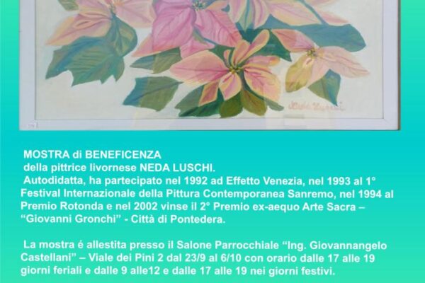 La Fondazione AVSI – Livorno, una ONLUS che realizza progetti di cooperazione allo sviluppo e aiuto umanitario in 40 paesi inclusa l’Italia, in collaborazione con la Parrocchia di S. Agostino, promuove una Mostra di Beneficenza delle opere della pittrice livornese Neda Luschi (sorella del pittore Nedo Luschi). La mostra, allestita nel salone parrocchiale “Ing. Giovannangelo Castellani”, in viale dei Pini 2, fino al 6 ottobre, sarà visitabile tutti i giorni feriali dalle 17 alle 19 e, nei giorni festivi, dalle 9 alle 12 e dalle 17 alle 19, con ingresso dal cancello dopo la canonica. I proventi che verranno raccolti dalla vendita delle opere della pittrice, saranno devoluti a sostegno dei progetti di sviluppo AVSI e delle opere della parrocchia.