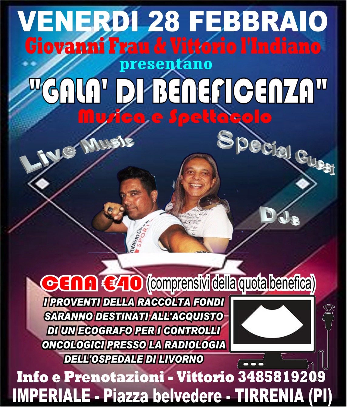 anno fa da una iniziativa congiunta tra il primario dott. Michele Malventi e la dott.ssa Maria Gallo, Simone Toschi del Ccn Modì Buontalenti, Giovanni Frau e Vittorio l’Indiano per la necessità di ampliare la strumentazione a disposizione del reparto volta ad alleggerire i tempi di attesa a favore dei controlli diagnostici oncologici. La raccolta è stata effettuata attraverso un percorso di eventi organizzati ed effettuati dagli stessi Giovanni Frau e Vittorio l’Indiano grazie alla collaborazione iniziale dell’associazione DeeJay FullTime Riccardo Cioni e successivamente proseguita con l’associazione sarda I Quattro Mori e Ccn Modì Buontalenti. “Grazie alla donazione da parte dei vari locali, istituzioni e Comuni che ci hanno ospitato nei loro eventi, l’autotassazione di parte dei cachet, la vendita di gadget, nonché la raccolta di donazioni spontanee di cittadini siamo riusciti a portare a termine l’impegno che ci eravamo prefissati. Vi invitiamo a partecipare all’ultima serata del 28 febbraio di musica, spettacolo e solidarietà che si svolgerà al ristorante La Prua del complesso Imperiale di Tirrenia che sarà allietata anche con il contributo artistico di vari ospiti. Tutti i proventi saranno destinati al reparto”.