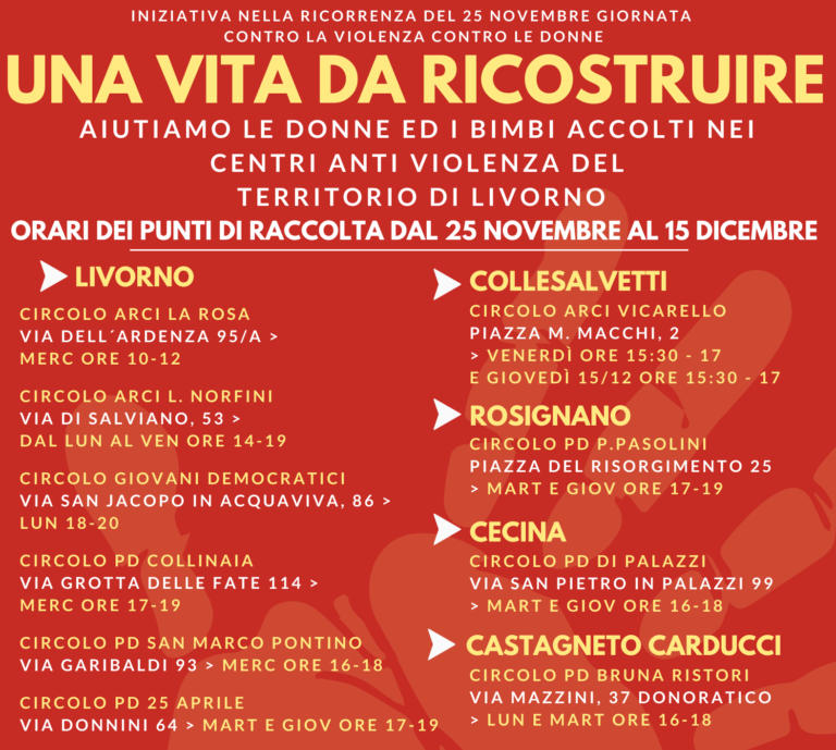 Una vita da ricostruire. Aiutiamo le donne ed i bimbi accolti nei Centri Anti Violenza del territorio di Livorno. Fino a giovedì 15 dicembre la raccolta di beni durevoli per le donne ed i bimbi a Livorno, Collesalvetti, Rosignano, Cecina e Castagneto Carducci. La Conferenza delle Donne Democratiche del territorio di Livorno, la Federazione del PD Livorno, i Giovani Democratici di Livorno ed i Circoli ARCI hanno proposto, in occasione della giornata di contrasto alla violenza contro le donne di venerdì 25 novembre una raccolta di beni durevoli per le associazioni/Enti che si occupano di supportare le donne vittime di violenza (ed i loro bimbi) sul territorio della Federazione del PD Livornese. La campagna di solidarietà si chiama “Una vita da ricostruire. Aiutiamo le donne ed i bimbi accolti nei Centri Anti Violenza del territorio di Livorno” e avrà durata fino a giovedì 15 dicembre su tutto il territorio. Si raccolgono i seguenti materiali, infatti le donne ed i bimbi che scappano dalla violenza spesso sono in fuga e portano con sé poche cose: