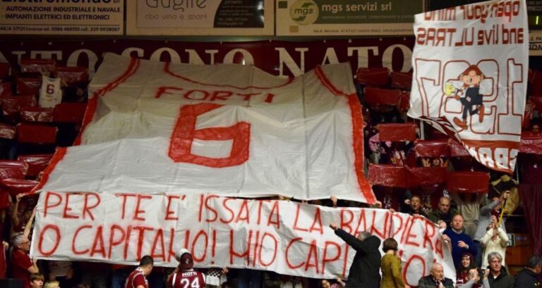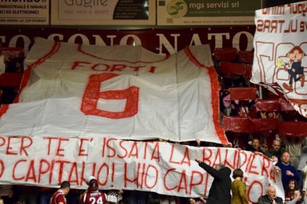 Coreografia da urlo per gli Sbandati che dalla Curva Nord fanno calare un’enorme maglia con il numero 6 e tanti cartelloni amaranto a far da cornice. Ogni persona sugli spalti in tribuna ha esposto un foglio con il numero 6. Inevitabili le lacrime di Forti che ha salutato tutti baciando la maglia e applaudendo.
