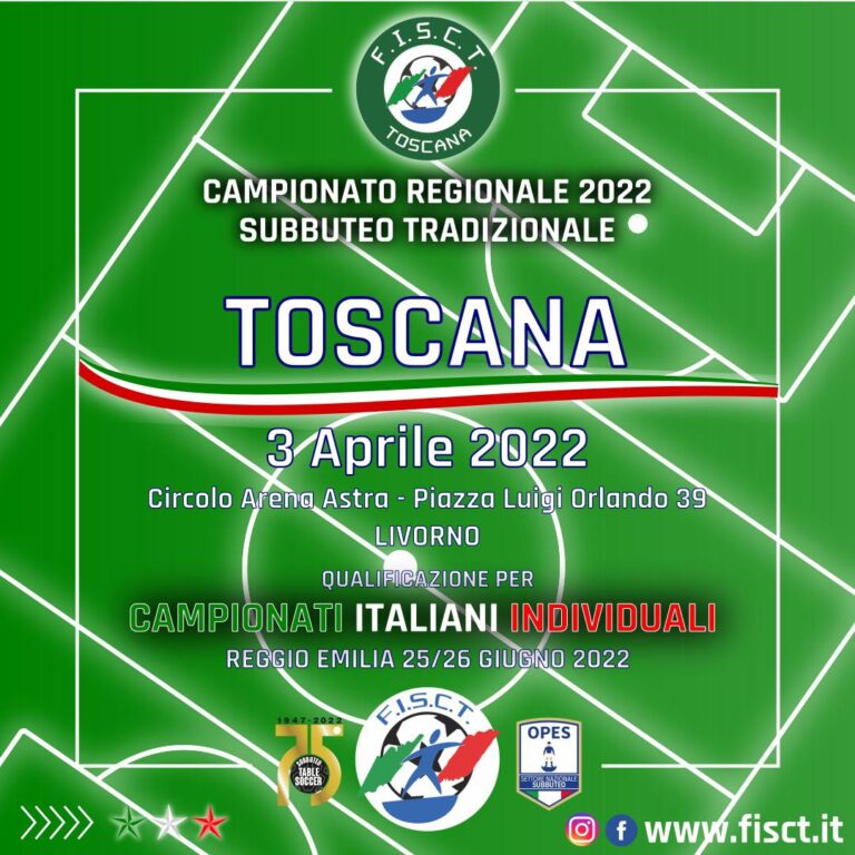 Domenica 3 aprile al Circolo Arena Astra di Livorno si svolgeranno i campionati regionali di Subbuteo tradizionale organizzati dal Club Calcio in Miniatura di Livorno. La competizione, che sarà valida come qualificazione ai campionati italiani assoluti, si preannuncia con la presenza di oltre 50 giocatori provenienti da quasi tutte le province della regione, tra questi alcuni dei migliori giocatori del panorama italiano.