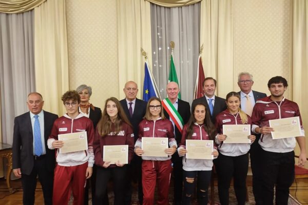 Cerimonia in Comune alla presenza del primo cittadino Salvetti, del Prefetto D’Attilio, della rappresentante del Miur Fabiani, del presidente della Federazione di atletica leggera Mei oltre al presidente della società amaranto Giannone