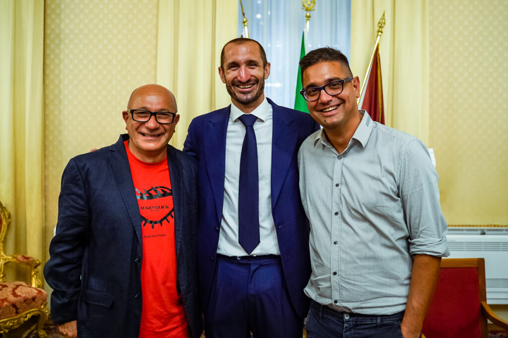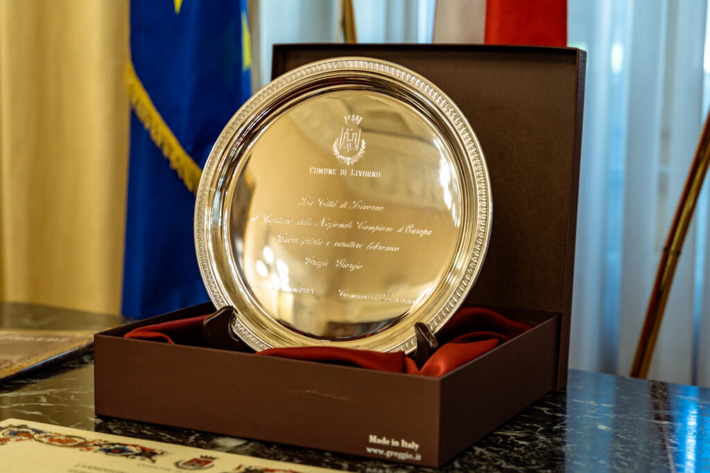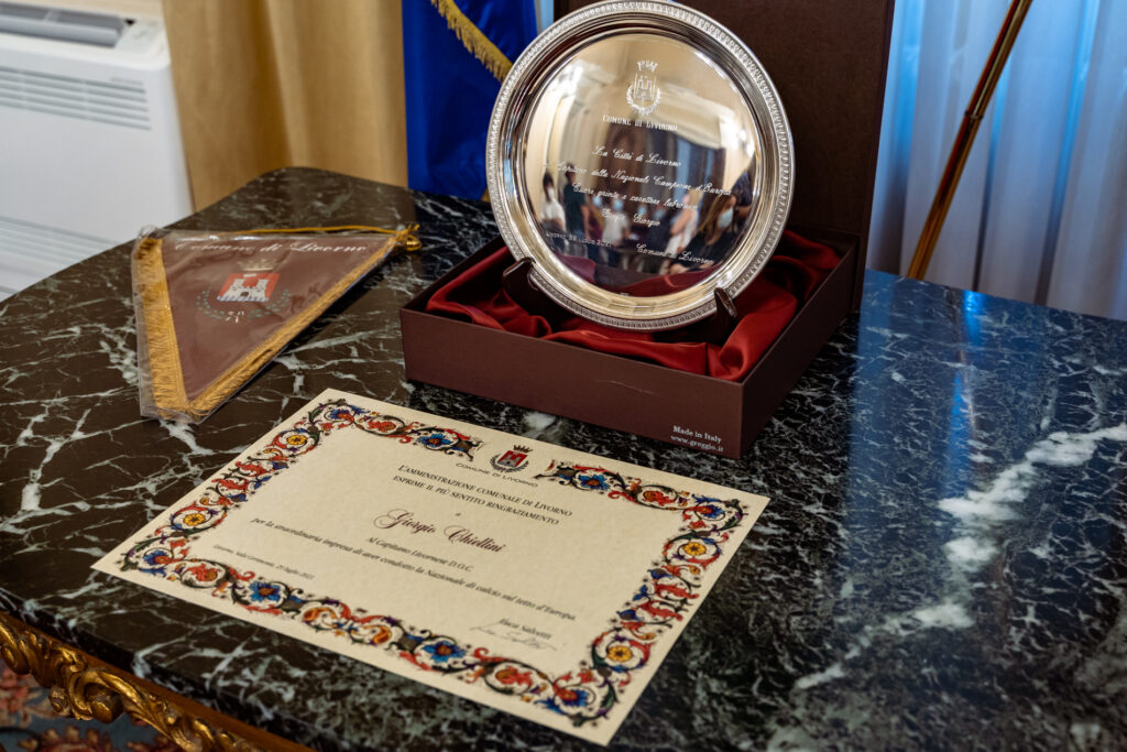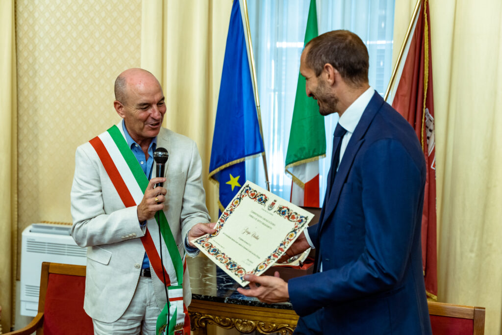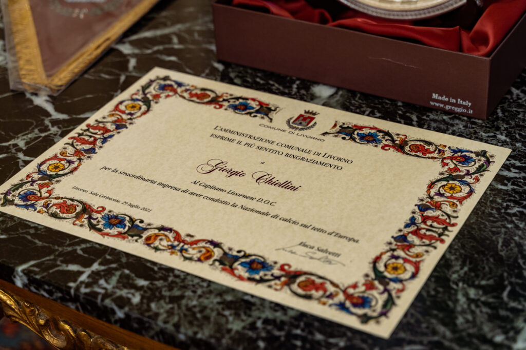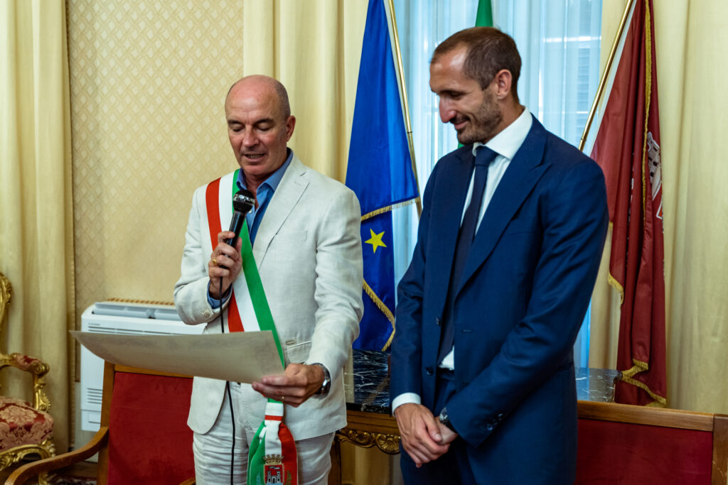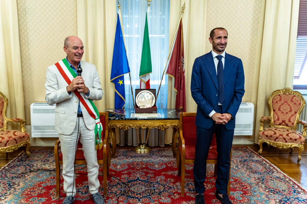 Accolto dalla città (clicca qui per rivedere la diretta FB) è stato abbracciato, si fa per dire, da tantissimi tifosi accorsi per salutare il difensore livornese tornato nella sua città: “Tutti hanno esultato per una Nazionale che ha ricostruito un feeling con il paese, un’operazione voluta e completamente riuscita – ha detto sorridente il sindaco Luca Salvetti – Il trionfo per noi è un orgoglio, ad alzare la coppa è un ragazzo amaranto, simbolo di questa piazza”. A seguire poi la cerimonia di consegna di una pergamena di riconoscimento e di un’onorificenza con “Re Giorgio” che poi ha parlato del suo rapporto con Livorno: “Ho realizzato un sogno che da bambino non potevo neanche immaginare. Esser qua mi ricorda tanti anni di quando ero un bimbo, ho avuto la fortuna di stare a casa fino a vent’anni, crescere con i valori giusti, con gli amici di sempre e andare in motorino dopo il liceo. A scuola dovevi andare bene sennò non giocavi a calcio”. Chiellini ha poi accennato alla delicata situazione della squadra, il Livorno Calcio, che lo ha forgiato: “La speranza di tutti noi tifosi è che si possa tornare presto a sognare e calcare certi palcoscenici. Il Livorno mi ha insegnato a essere un uomo e un calciatore, avevo 16 anni e in campo riuscivo a essere irriverente nonostante fuori fossi più timido. Igor Protti (presente nella sala del Comune e poi in piazza del Luogo Pio, ndr) e Osvaldo Jaconi sono persone che mi hanno dato tanto e continuano a farlo”.