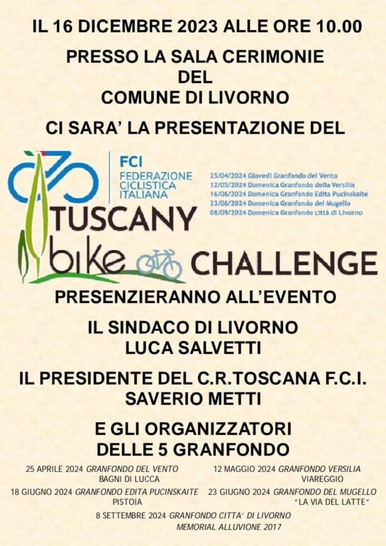 IL G.S.Carli Salviano ASD dà appuntamento a sabato 16 dicembre alle ore 10 nella sala consiliare del Comune dove si terrà la presentazione del “Tuscany Bike Challenge”, un circuito composto da 5 eventi ciclistici del tipo Granfondo. In programma da aprile a settembre sulle strade della nostra regione: si apre con la Granfondo del Vento di Bagni di Lucca 25.04.24, chiamata così in onore delle Grotte del Vento, passando per la Granfondo Versilia 12.05.24, la Pucinskaite di Pistoia 16.06.24, la Granfondo del Mugello 23.06.24, fino ad arrivare all’8 di settembre Granfondo Città di Livorno – Memorial Alluvione Anno 2017, gara quest’ultima che vuole ricordare, come nella passata edizione, la terribile alluvione che ha colpito la città. La Granfondo di Livorno decreterà anche le classifiche finali del Challenge, ci saranno le premiazioni dei singoli atleti e delle società che si sono distinte per il risultato e l’assidua partecipazione ma sarà sicuramente l’occasione per fare il punto su uno sport che attraversa, sia a livello amatoriale che professionistico, un momento di crisi.