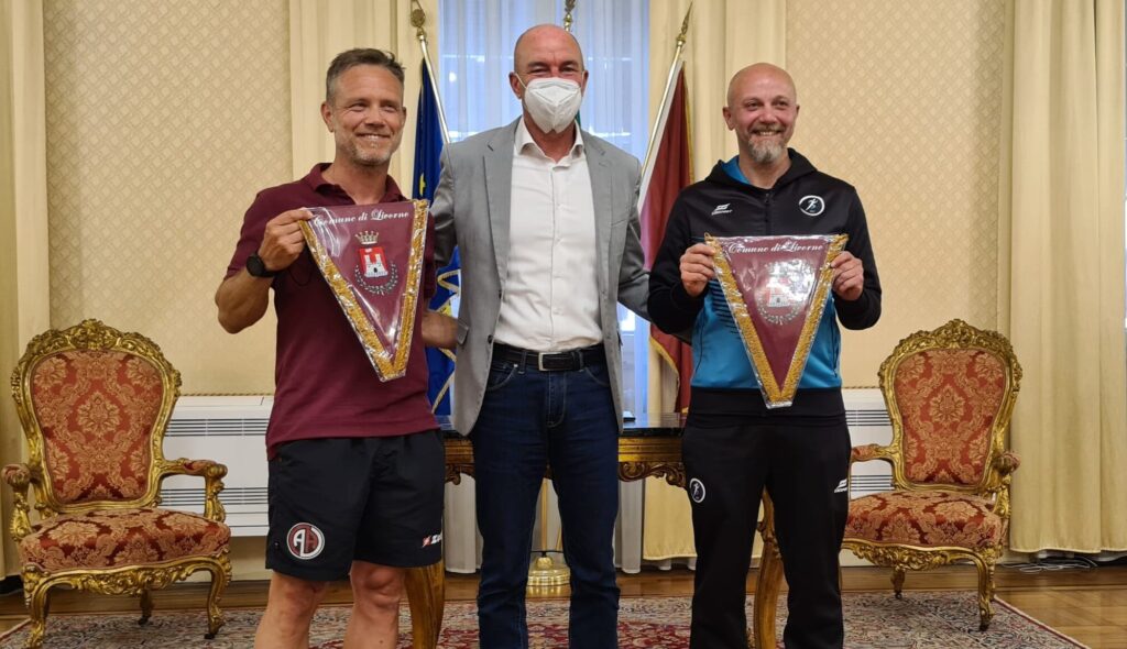 Il sindaco Luca Salvetti ha incontrato in Sala Cerimonie a Palazzo Comunale i rappresentanti dei quattro atleti livornesi che parteciperanno alla gara podistica 100 km Del Passatore che avrà inizio sabato 21 maggio alle 15 a Firenze per concludersi il giorno successivo a Faenza (nella foto il sindaco, Gabriele Mastrosimone e Vittorio Vinciguerra). Due le squadre labroniche che correranno la ultramaratona 100 km Del Passatore: Atletica Amaranto Asd rappresentata dagli atleti Vittorio Vinciguerra e Michele Petroni e Sempre di Corsa Asd rappresentata da Gabriele Mastrosimone e Alessandro Annibale. 3800 i partenti alla gara provenienti da 30 Nazioni, anche oltre Oceano. Il sindaco durante l’incontro ha donato a Mastrosimone e Vinciguerra un gagliardetto della Città di Livorno, come buon auspicio per la gara podistica.