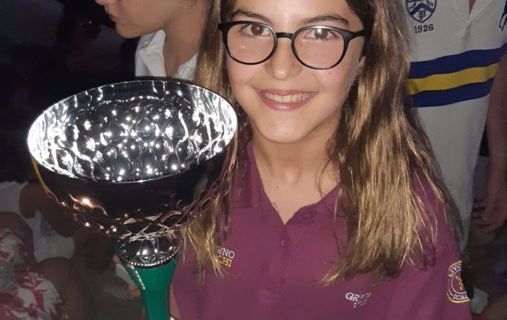 Greta Viti, in forza a Livorno scacchi, con la coppa di neo campionessa italiana under 12 a Terrasini (PA)