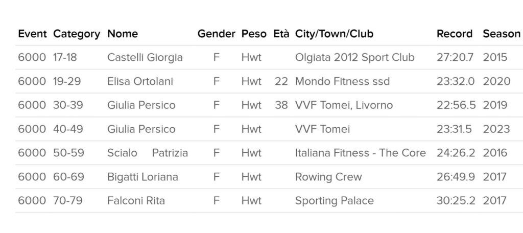 Nel canottaggio in acqua, date le mutevoli condizioni del vento, della corrente e dei fondali, i tempi con cui si svolgono le regate sono certamente importanti ma non permettono di stabilire veri e propri record. Così ai canottieri corre in “soccorso” uno strumento simulatore di voga nato per gli allenamenti, il remergometro, che essendo ormai standardizzato a livello mondiale consente attraverso un display computerizzato e un codice di autenticazione di storicizzare i tempi in un sistema internazionale gestito dalla Concept 2. In questo sistema sono registrati tutti i record per categorie, distanze ed età. Giulia Persico atleta del Gruppo Sportivo VVF Tomei era già presente nel ranking con il record italiano sulla distanza dei 6000 m per l’età 30/39 anni stabilito nel 2019 e in questi giorni ha stabilito anche il record per l’età 40/49. Qra detiene il primo e il secondo tempo nella speciale classifica italiana. Partita con un regime basso di colpi al minuto, Giulia ha progressivamente incrementato i colpi per rendere meno dura la palata con l’aumentare della fatica, concludendo con il tempo di 23’31”5. L’atleta a fine prova era sicuramente provata per lo sforzo, ma anche convinta di poter migliorare ancora. Chi sa che non possa regalarci altre soddisfazioni nel futuro.