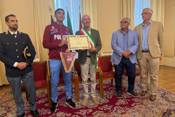 Lo sciabolatore livornese, 23 anni compiuti a maggio, ha ricevuto dal sindaco Salvetti una pergamena e il gagliardetto della città