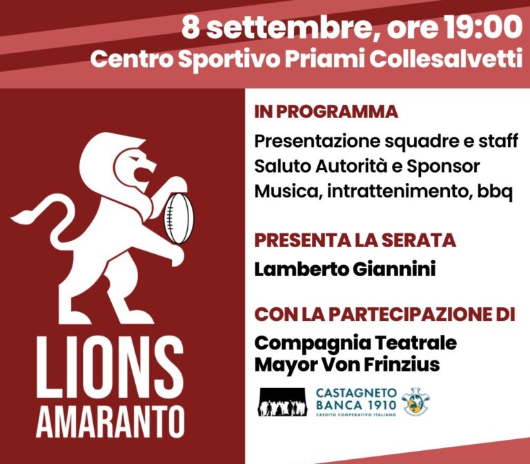 Alla presenza degli oltre 500 tesserati della LundaX Lions Amaranto, con relativi accompagnatori, delle autorità comunali, degli sponsor e dei tecnici, è in programma dalle 19 alle 22,45 dell’8 settembre, nel proprio quartier generale, l’ampissimo plesso sportivo ‘Emo Priami’ di via Marx a Stagno, la presentazione ufficiale della nuova stagione del club rugbistico LundaX Lions Amaranto. Lamberto Giannini condurrà l’evento, con la Compagnia Teatrale Mayor Von Frinzius che simpaticamente coinvolgerà tutti quanti in ‘lezioni di teatro’. Nel corso della serata, spazio alla presentazione della prima squadra amaranto, che dal 16 ottobre, sotto la guida del tecnico Fabrizio Gaetaniello sarà impegnata nel campionato di B. Ci sarà spazio inoltre per la presentazione di tutte le altre dieci rappresentative amaranto (under 19, 17, 15, 13, 11, 9, 7 e 5, squadra Old e squadra Touche).