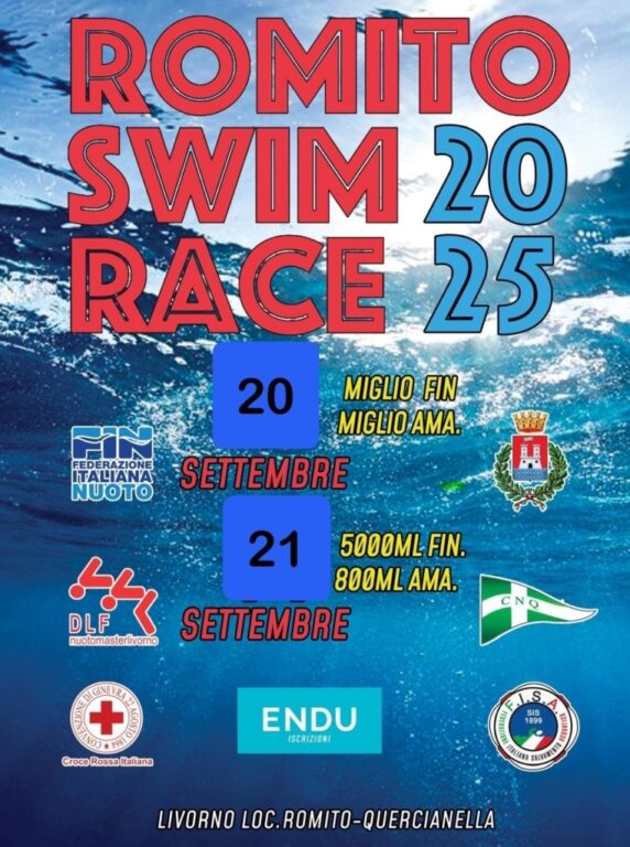E’ tutto pronto per la sesta edizione della Romito Swim Race 2025 patrocinata dal Comune di Livorno. Sabato 20 e domenica 21 settembre 600 atleti si sfideranno nelle acque di Quercianella in quella che è diventata una delle manifestazioni di nuoto in acque libere più importanti in Italia. Si parte il sabato pomeriggio con le due gare del Miglio Marino Fin ed Amatori, per proseguire la domenica mattina con la 5k che partirà dal Maroccone per concludersi a Quercianella ed il gran finale con la 800 sprint di domenica pomeriggio dai bagni Paolieri al Moletto sempre a Quercianella. Il mare del Romito si tingerà di giallo con le cuffie, le boette di segnalazione e le grandi boe del percorso, ci sarà la cronaca in diretta, musica, ristoro per 2 giornate all’insegna dello sport e del divertimento. Ci sarà solidarietà con già 8.000 euro raccolti per le associazioni: Autismo Livorno, Down Italia Livorno e Volare Senz’ali. Inoltre l’intero ricavato della gara degli 800 “Swim With Debo Memorial” andrà alla famiglia dell’allenatrice Debora Ramalli scomparsa lo scorso inverno. “Vi aspettiamo al Molletto di Quercianella”.