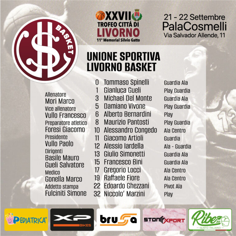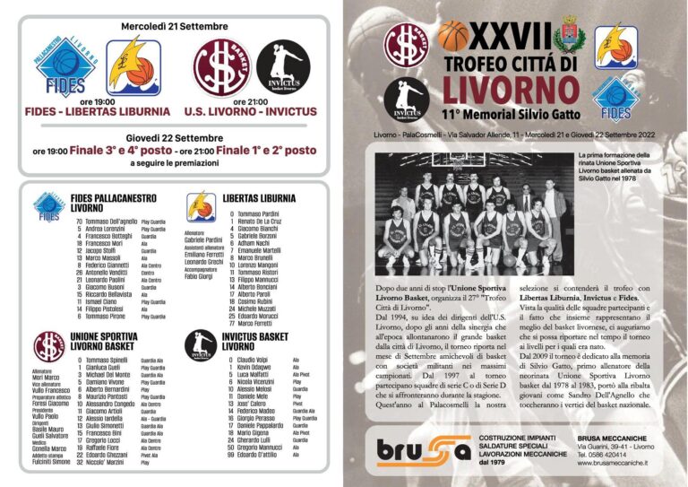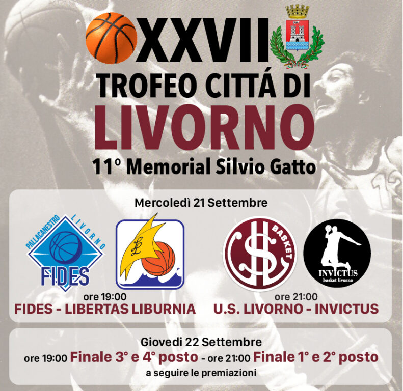 Dopo le interruzioni del 2020 e 2021 dovute alla pandemia Covid, l’Us Livorno Basket torna alla piena attività e riprende l’organizzazione per il ventisettesimo anno il quadrangolare di basket Trofeo Città di Livorno – 11° Memorial Silvio Gatto diventato il tradizionale appuntamento di basket cittadino pre-campionato, prima vera sfida cittadina prima dell’inizio dei rispettivi campionati. Si torna dunque sul parquet il 21 e 22 settembre al PalaCosmelli in via Allende, 11.