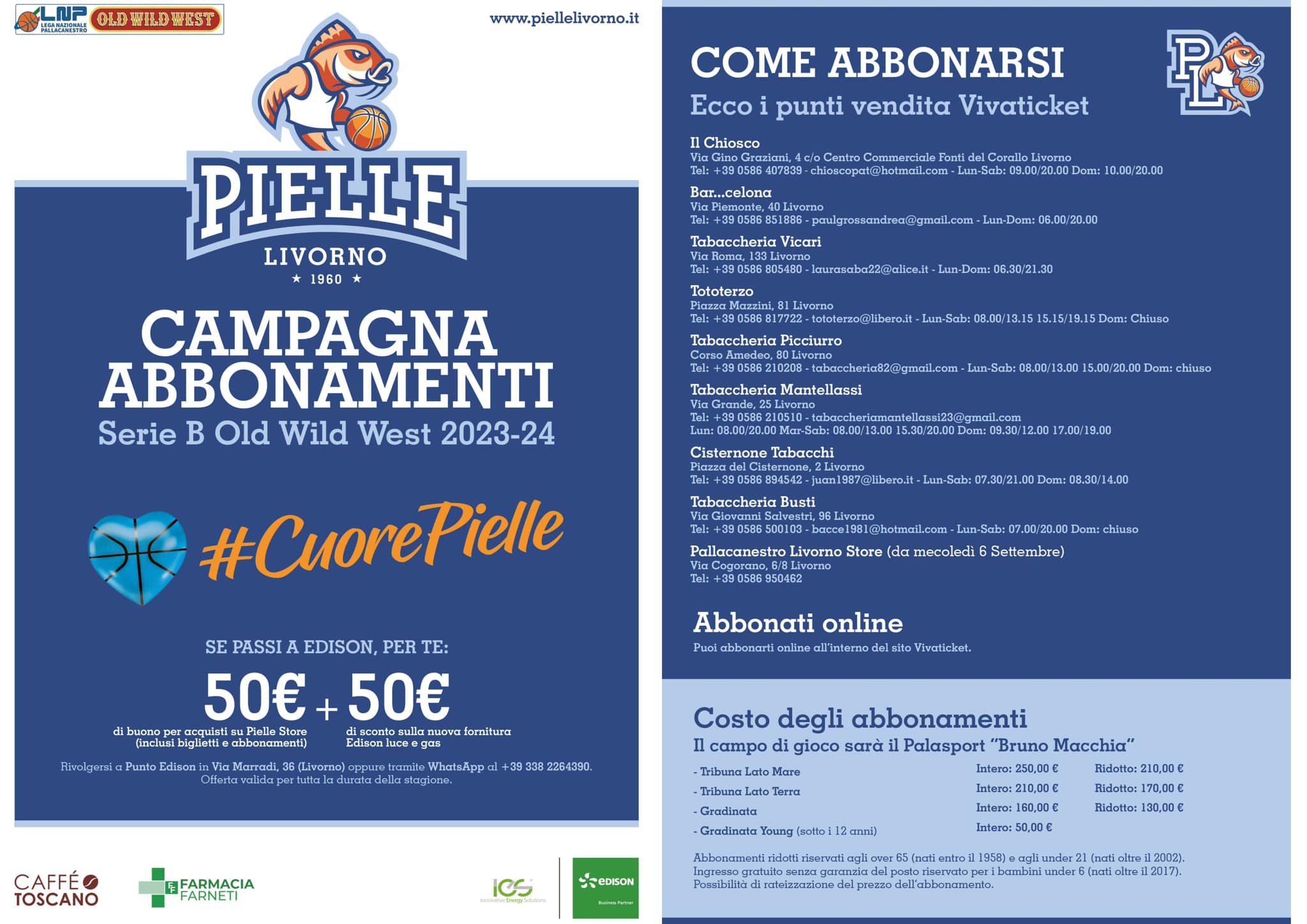 Prende il via la campagna abbonamenti 2023/2024 targata Pielle Livorno che ha per slogan #CuorePielle. Tante news e ben 4 scelte a disposizione per gli spazi del PalaMacchia: tribuna lato mare, tribuna lato terra, gradinata e gradinata young (sotto i 12 anni). Clicca sulla clip bianca su sfondo azzurro sopra al titolo per tutti i dettagli.