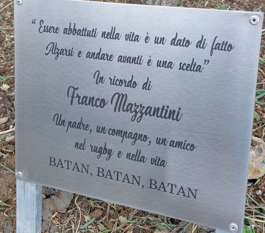 Accanto a due giovani querce, piantate in suo onore, sono state scoperte due targhe che recitano ‘Essere abbattuti nella vita è un dato di fatto, alzarsi e andare avanti è una scelta. In ricordo di Franco Mazzantini, un padre, un compagno, un amico, nel rugby e nella vita. Batan, batan, batan'.