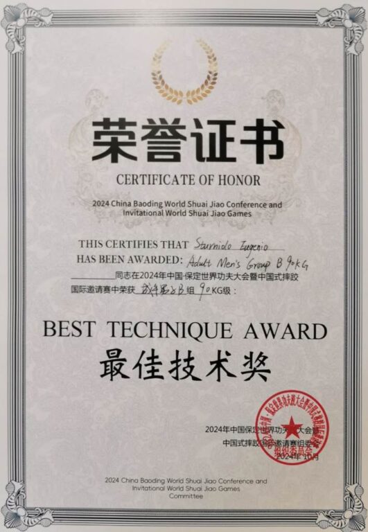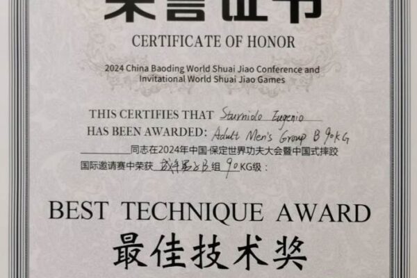La finale della competizione, combattuta contro l’avversario cinese Arjan, uno dei migliori atleti della Mongolia interna, ha visto Eugenio esibirsi in una prestazione eccezionale. Non solo l’atleta ha raggiunto il secondo gradino del podio, ma è stato anche premiato per la migliore azione tecnica della categoria, un riconoscimento che attesta il suo livello di competizione. Alla manifestazione sportiva, valevole come campionato mondiale, hanno partecipato 13 atleti italiani della Italian Shuai Jiao Union, accompagnati dal maestro Antonio Langiano, principale divulgatore di questa disciplina in Europa e in Medio Oriente, e dal maestro Alessio Pasciulli, l’unico Campione del Mondo nella storia dello Shuaijiao per un Europeo e detentore di numerosi trofei internazionali. Eugenio Sturniolo ha dimostrato che con dedizione, disciplina e passione, è possibile competere e eccellere ai massimi livelli di questo sport. La sua performance in Cina non solo ha portato lustro alla palestra Asd Senshi Judo di via Grotta delle Fate ma ha anche rafforzato la posizione dell’Italia nel panorama internazionale del Shuai Jiao.