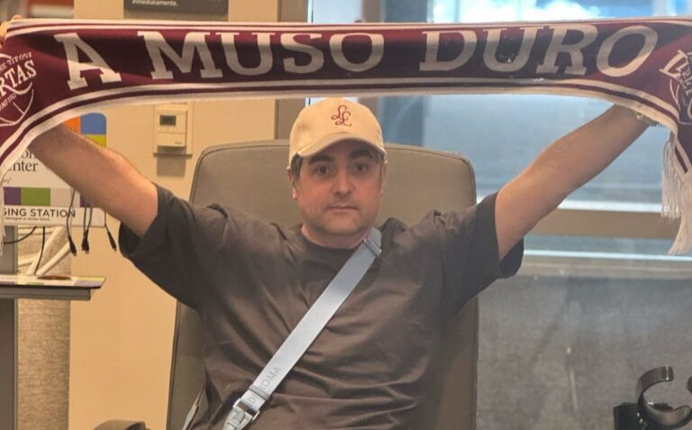 Una sciarpa amaranto che gli copre le spalle. In testa l’immancabile cappellino targato LL. Il passo, su quelle stampelle, è sicuro verso quella campanella che lo attende. Marco Benvenuti, neo presidente della Libertas Livorno 1947, ci arriva davanti. La guarda. Sospira. “Ehhhh… well done”. Ben fatto, si dice da solo suonando così la fine. Il “drin” risuona nel corridoio mentre i sanitari che lo hanno accompagnato in queste settimane lo applaudono. E lui guardandosi intorno ringrazia. Pochi secondi che vogliono dire una vita. È questo che si vede in questo piccolo video che pubblichiamo qui in pagina con l’autorizzazione dello stesso Benvenuti, che ringraziamo di cuore per la disponibilità, e che lo stesso numero uno della società amaranto ha postato sui suoi social. “Suonata la campanella… radiazioni finite… come sempre a muso duro… e ora inizia il countdown per Livorno”.