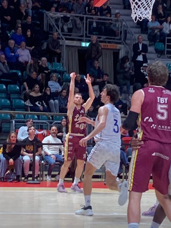 Il grande, immenso cuore della Bi. Emme Service Libertas Livorno 1947 ha condotto gli amaranto ad un passo da un’impresa pazzesca (clicca qui per il tabellino finale). Sotto di 17 al crepuscolo del terzo quarto (50-33), chiuso sul -16 (58-42), la squadra di coach Diana nel finale con una rimonta incredibile si è portata fino al minimo svantaggio prima di essere punita dai tiri liberi dei padroni di casa (nella fattispecie di Della Rosa) nei convulsi attimi finali in cui era necessario ricorrere al fallo sistematico.