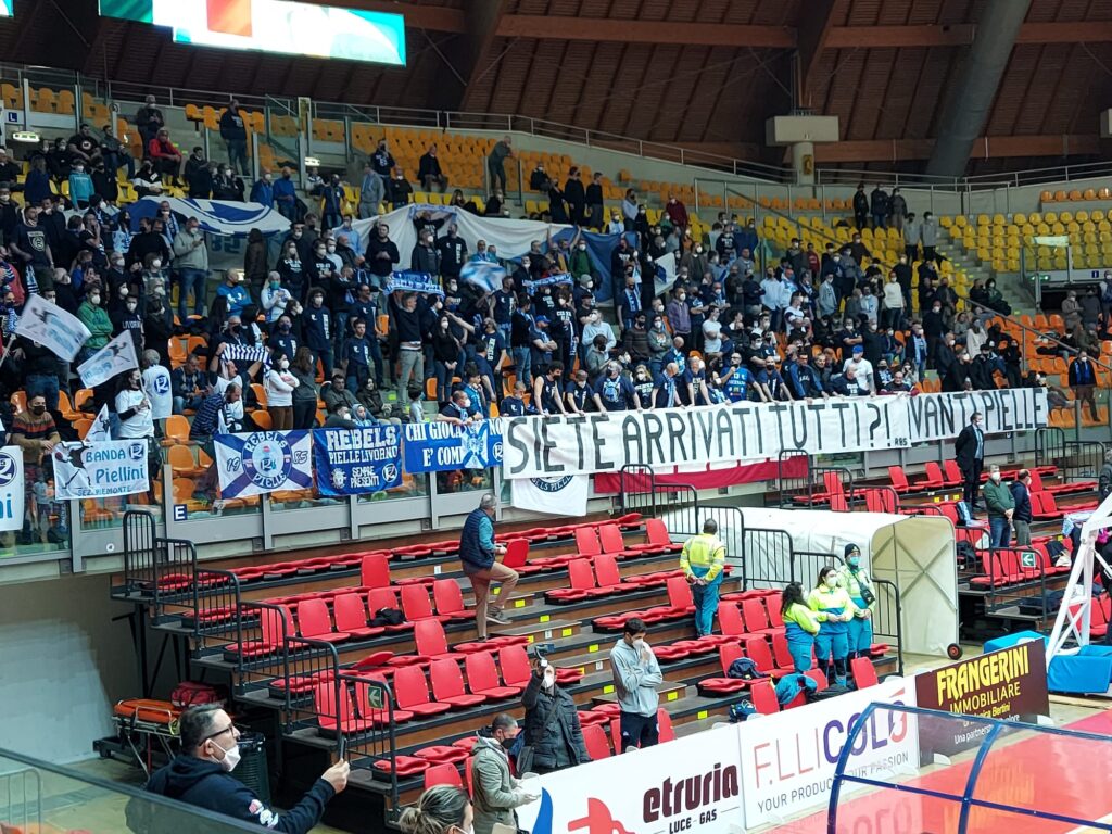 Dominio assoluto della Pielle. Senza se e senza ma. Un derby che si tinge di un colore solo: quello biancoazzurro che sventola fiero in curva Sud al termine di una stracittadina sentita e vissuta a pieno dai circa duemila presenti. Pubblico delle grandi occasioni e tifoserie spettacolari al Modigliani Forum per questo ritorno della stracittadina di basket (clicca qui per il tabellino dell’incontro). Primo quarto di marca biancoazzurra con la Pielle molto più cinica rispetto alle maglie amaranto in campo. Libertas sprecona in molte occasioni in attacco sia da tre punti che sotto canestro. La Pielle realizza molto mettendo a segno bombe su bombe e stacca il primo quarto senza problemi. Libertas alla ricerca di se stessa. La prima frazione termina 12 a 27.