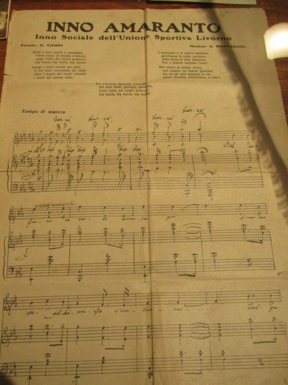 Non poteva mancare all’interno dell’esposizione anche uno spazio dedicato all’Inno Amaranto,“L’amaranto è la nostra bandiera”, risalente agli anni Trenta, composto dal maestro Alberto Montanari, su testo dell’avvocato Giorgio Campi. Sarà esposto lo spartito e probabilmente anche il disco originale. Certa la sua esecuzione in occasione dell’inaugurazione della mostra.