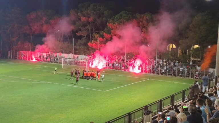 Cori e fumogeni, il verde che si colora d’amaranto. Torna a giocare l’Us Livorno 1915 che vince e convince contro un arcigno Rosignano. I ragazzi di mister Buglio, accompagnati dai fumogeni e i cori dei tifosi amaranto, pur con soli quattro giorni di allenamento alle spalle, dimostrano di avere una bella gamba e una buona condizione fisica. A primeggiare su tutti sono Andrea Ferretti e Tommaso Bellazzini. L’attaccante si muove con esperienza facendo spazio per i compagni e arrivando più volte al tiro. Il trequartista ex Cittadella e Alessandria, invece, dimostra il perché abbia giocato per anni in serie B. Autentico metronomo del centrocampo, ogni pallone passa dai suoi piedi e viene smistato per gli esterni. E Sono proprio i due terzini Franzoni e Palmiero, giovanissimi, che nel 4-3-1-2 di Buglio sfoderano un’ottima prestazione sotto il profilo dell’intensità. Bene anche Matteo Frati e Cesare Pulina, il classe 2002 segna il gol del momentaneo 1-1 dando il via alla goleada amaranto. Appuntamento per mercoledì 8 settembre alle 20.30 quando l’US Livorno sfiderà, sempre a Rosignano, il Prato 2000.