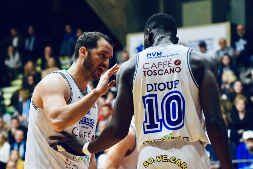 La Caffè Toscano Pielle Livorno domina i primi due quarti (47-31 sulla sirena dell’intervallo lungo). Atteggiamento iniziale da grande capolista. Da squadra a cui devi chiedere il permesso. Poi nella seconda metà del match subisce un po’ il ritorno di fiamma della Paperdì Caserta, come,, era prevedibile. Ma solo in parte. La partita si complica più del previsto tanto da mangiarsi il massimo vantaggio di +20 che si assottiglia a +3 (75-72) a una manciata di giri di lancetta dalla fine. Ci pensa il sangue freddo di Diouf con un doppio canestro a due minuti dal termine e i punti in cascina di Lo Biondo e Chiarini che fanno da cuscino per dormire sogni tranquilli e per tenere in mano la vetta (in condominio con Herons) scrollandosi di dosso i cugini della Libertas che inciampano a Rieti. E adesso un San Valentino da innamorati a Cassino per il turno infrasettimanale. Ecco le pagelle che la redazione di QuiLivorno.it confeziona per il team che, nella giornata in corso, gioca il match tra le mura amiche.