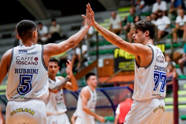 Nella foto fornita dall'ufficio stampa della Caffé Toscano Pielle Livorno un "five" tra Campori e Rubbini