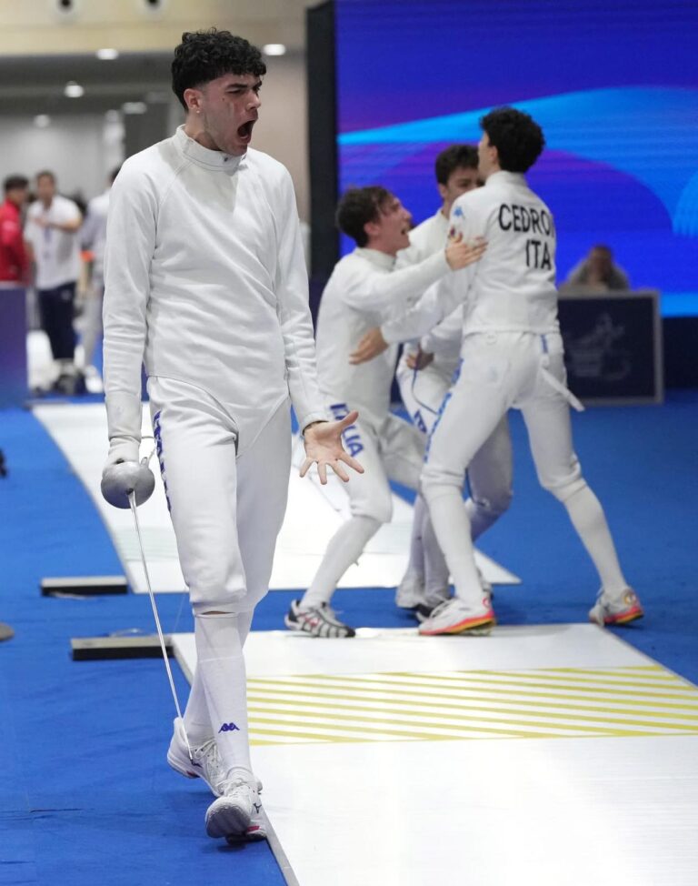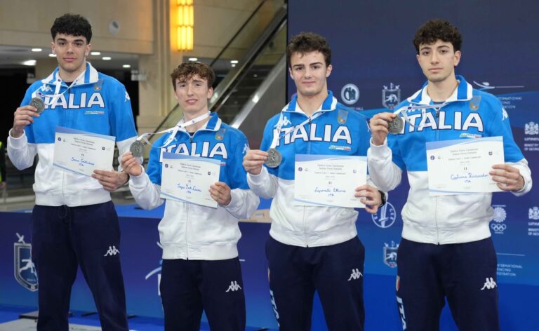 È però nella gara a squadre che il giovane livornese delle Fiamme Oro ha raggiunto il risultato migliore dato che, insieme ai suoi compagni di squadra, è salito sul secondo gradino del podio portandosi a casa una bella medaglia di argento. Anche qui, come nella gara individuale, la costante è stata una serie di assalti combattuti fino all’ultima stoccata che hanno visto gli azzurrini uscire vincitori contro la Russia per 44-43 e contro l’Ungheria per 44-42 prima della sconfitta in finale per 45-42 contro la Francia.