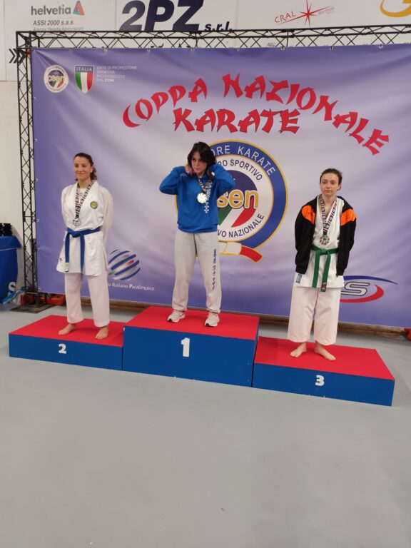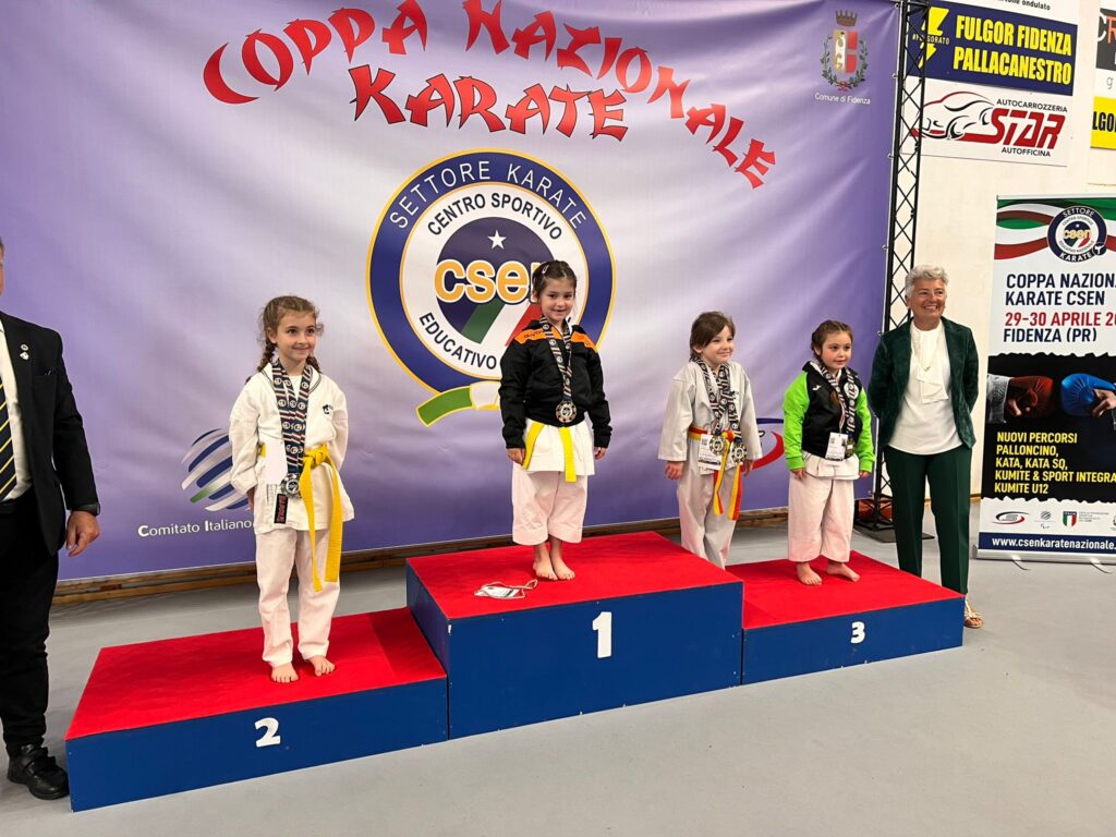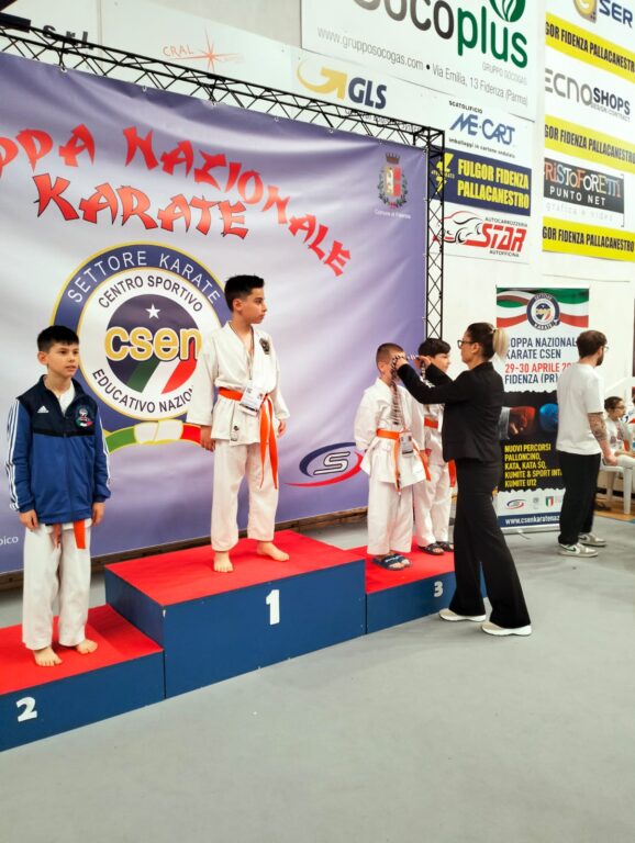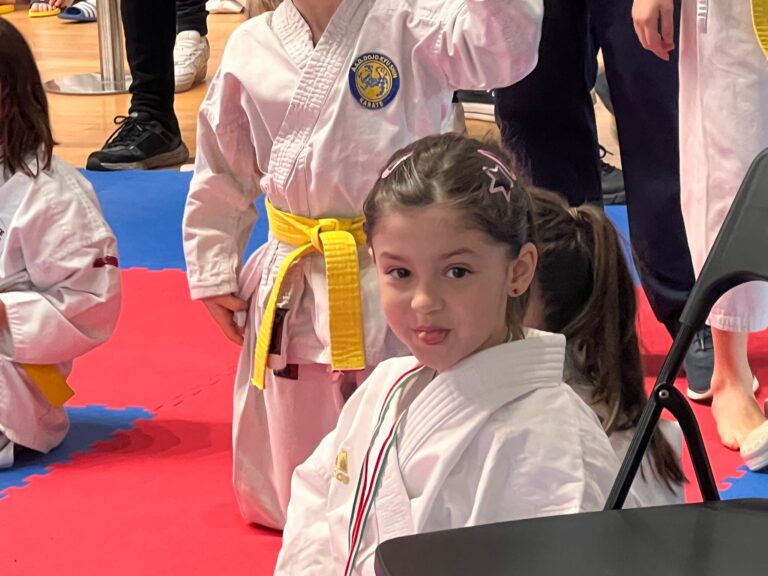 La prima prova kata Emma Pullerà la più piccola categoria bambini di 15 atleti ha strappato il podio arrivando 1° diventando così campionessa d’Italia karate CSEN nella sua categoria.