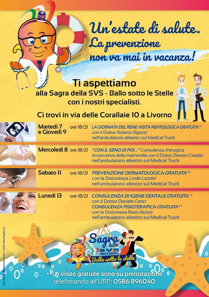 “E’ la festa dei nostri volontari – spiega la presidentessa Marida Bolognesi – Grazie al loro impegno, unito all’aiuto dei nostri sostenitori, riusciamo ad organizzare e migliorare questo evento. Abbiamo la necessità di mantenere alta l’attenzione al benessere dei cittadini: per questo oltre allo svago e l’intrattenimento verrà dato ampio spazio alla prevenzione sanitaria”. Grazie alla collaborazione col Polo della Salute, durante l’evento sarà presente il medical truck all’interno del quale sarà possibile effettuare delle visite ad offerta libera, prenotandosi allo 0596/896040 nella fascia oraria che va dalle 18 alle 21 (in allegato, il calendario con i controlli in programma). Nella serata dell’8 agosto verrà inaugurata una nuova ambulanza per i servizi ordinari, acquistata con i proventi derivati dal 5×1000 e dalla scorsa edizione della Sagra, che verrà dedicata a due volontari storici dell’associazione venuti a mancare lo scorso anno. “In un certo senso è anche la festa della città – continua Marida Bolognesi – Chi parteciperà, aiuterà a rinforzare i servizi che Svs offre al territorio”. “Abbiamo spostato l’evento alla nostra sede – aggiunge il direttore Francesco Cantini – in modo che le persone possano conoscere le nostre attività e vedere dove operano i volontari (e, perché no, unirsi al mondo del volontariato). E’ l’unica festa di raccolta fondi il cui intero ricavato va a potenziare le attrezzature. Ci auguriamo che sia un successo e che ci sia massima condivisione tra i cittadini”.