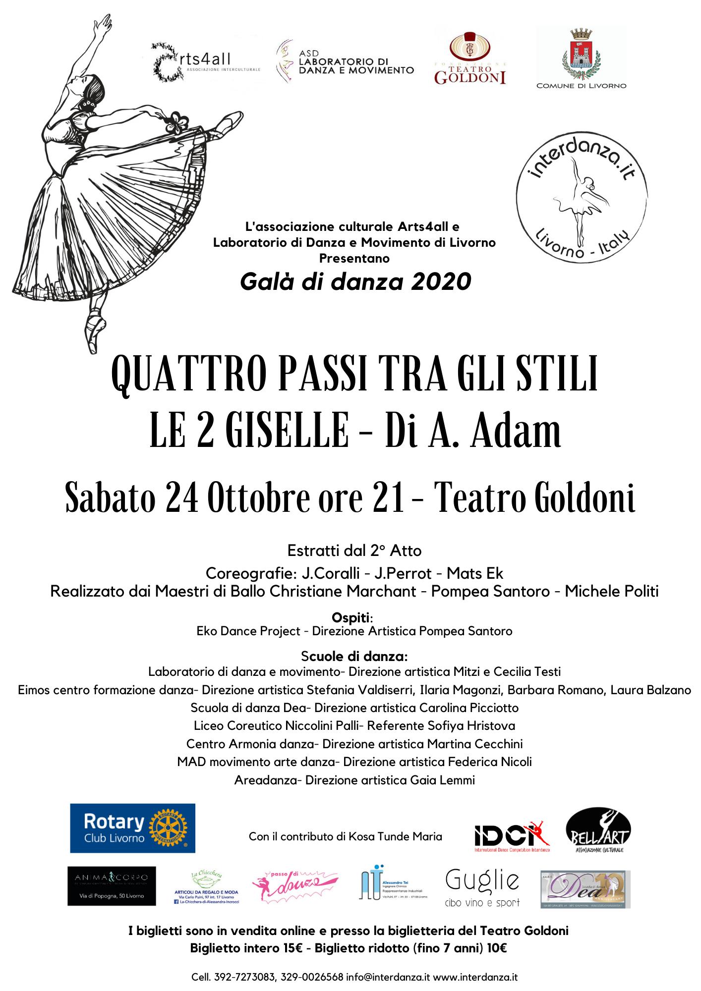 Amore, disperazione, rabbia, pentimento: è la “Giselle” di Adolphe-Charles Adam, uno dei balletti più amati e rappresentati al mondo. Una storia senza tempo, fonte di ispirazione interpretativa e coreografica, ma anche formidabile banco di prova per l’esplorazione e la formazione nel campo dell’arte coreutica: se ne potrà avere un alto e coinvolgente esempio nel Galà di Danza “Le due Giselle” in programma sabato 24 ottobre, alle 21, al Teatro Goldoni momento finale di “Interdanza” un progetto didattico-artistico promosso da Arts4all Associazione Interculturale e Laboratorio di Danza e Movimento in collaborazione con l’Associazione Culturale Bellart. “E’ con grande gioia ed emozione che presentiamo l’ottava edizione di Interdanza – affermano Eva Kosa e Mitzi Testi che ne firmano la direzione artistica  –  un percorso multidisciplinare nato nel 2012 con lo scopo di promuovere la pratica e la conoscenza della danza e delle arti ad essa correlate (musica, letteratura, arti figurative ed espressive), coinvolgendo studenti di danza di nazionalità diverse guidati da docenti di chiara fama ed affiancati da ballerini professionisti internazionali. Un percorso – proseguono – che proprio in un momento di così grande difficoltà, valorizza ancora più il lavoro svolto da tutti i ragazzi che hanno l’opportunità di partecipare a stages, workshop, spettacoli con Maestri di grande spessore ed esperienza”. Il Gala rappresenta così lo spettacolo clou del progetto ed andrà in scena nel rispetto del distanziamento sociale e delle norme stabilite dai decreti sanitari anti-covid: “Assisterete a coreografie create ex novo – aggiungono gli organizzatori – ideate in questo nuovo periodo della nostra nuova esistenza, la quale ci ha imposto  nuovi comportamenti e stili di vita; ma in particolare, assisterete, per la prima volta, ad un grande balletto classico del passato, Giselle, riproposto in una versione particolare che cercherà di non  snaturare lo spirito romantico del periodo al quale appartiene”. La novità de “Le due Giselle” non consisterà però solo in questa rivisitazione dovuta agli eventi pandemici, ma sarà il risultato di un progetto didattico firmato dal M° Michele Politi, destinato ad ampliare le conoscenze tecniche, stilistiche, storiche e filologiche del balletto di Adam, accostando il celebre secondo atto della versione tradizionale classica, alla versione contemporanea ideata dal coreografo svedese Mats Ek nel 1982. Si assisterà così alla prima parte tradizionale, rimontata da Christiane Marchant e Michele Politi, ed interpretata da un corpo di ballo composto da 19 allieve selezionate tra le scuole di danza di Livorno; i ruoli principali saranno interpretati da quattro danzatori dell’Eko Dance Project. La coreografia di Mats Ek, rimontata da Pompea Santoro, sarà interpretata dai ballerini dell’Eko Dance Project, la cui straordinaria partecipazione arricchisce la nuova edizione di “Interdanza”. Oltre “Le due Giselle” sono stati proposti da Interdanza altri tre laboratori coreografici a cura della prof.  Sofiya Hristova del Liceo coreutico Niccolini Palli e il M° Politi, sulle musiche di Mozart, Prokofiev e Ciakovskij. Protagonisti sono gli alunni di varie scuole di Livorno con età a partire dagli 8 anni in su.