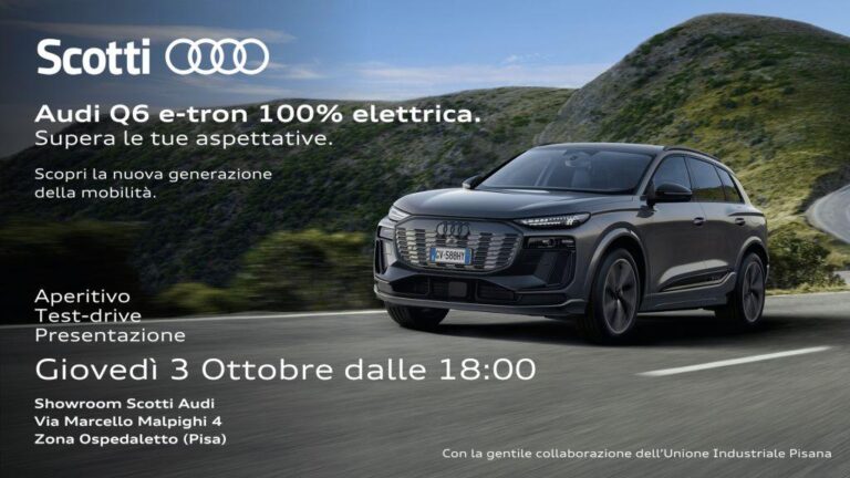 Giovedì 3 ottobre, a partire dalle ore 18:00, lo showroom Scotti Audi di Pisa aprirà le sue porte per offrirti un assaggio del futuro della mobilità. Preparati a scoprire il nuovo standard di comfort e innovazione, unendo l’autonomia straordinaria della tecnologia elettrica Audi a interni di design futuristico che ti faranno subito percepire il salto verso una nuova era. Durante l’evento, ti aspetta un aperitivo di benvenuto, occasione perfetta per immergerti nell’atmosfera esclusiva dell’evento. Potrai inoltre vivere l’emozione della Nuova Audi Q6 e-tron in prima persona, provandola su strada insieme a uno dei nostri consulenti esperti.