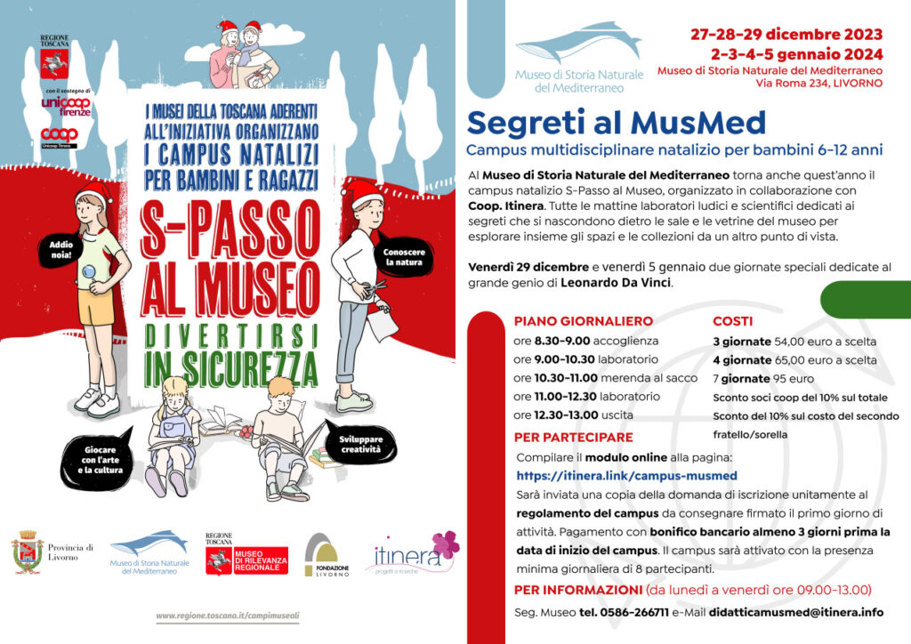 Al Museo di Storia Naturale del Mediterraneo torna anche quest’anno il campus natalizio S-Passo al Museo, organizzato in collaborazione con Coop. Itinera, con laboratori ludici e scientifici dedicati ai segreti che si nascondono dietro le sale e le vetrine dei musei. Infatti, in questi mesi i nostri settori espositivi sono interessati da importanti lavori di ristrutturazione, adeguamento e rinnovamento, grazie ai finanziamenti ottenuti con il PNNR M1C3-3 per la rimozione delle barriere fisiche e cognitive nei musei e luoghi della cultura. Questo periodo così speciale per il Museo sarà l’occasione per esplorare, attraverso attività ludico-scientifiche, gli spazi e le collezioni da un altro punto di vista. Nelle giornate di venerdì 29 dicembre e venerdì 5 gennaio le attività saranno dedicate al grande genio di Leonardo da Vinci. L’iniziativa “s-passo al museo” è promossa dalla Regione Toscana in collaborazione con Unicoop Firenze e Unicoop Livorno ed i musei della Toscana delle de territori di Pisa, Lucca, Firenze, Arezzo, Grosseto, Livorno. Sono previste scontistiche per soci coop del 10% sul totale. Sconto del 10% sul costo del secondo fratello/sorella.