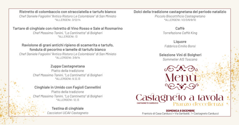 Il pranzo d’eccellenza, con i suoi piatti gourmet e della tradizione, rappresenta il momento clou di Castagneto a Tavola 2024, offrendo un’esperienza indimenticabile per tutti i partecipanti. Il pranzo avrà luogo domenica 8 dicembre alle ore 13.00 presso il “Frantoio” di Casa Carducci con, per la prima volta, la partecipazione del tartufo di San Miniato in un gemellaggio fra tipicità toscane. Il menù è a cura dello Chef Daniele Fagiolini di “Antico Ristoro Le Colombaie” di San Miniato e di Massimo Tanini de “La Cantinetta” di Bolgheri, oltre alla collaborazione con i Cacciatori UCAV che hanno realizzato la rinomata “testina di cinghiale” e dei produttori del territorio che contribuiranno a rendere il pranzo “d’eccellenza”, in particolare il Consorzio per la Tutela dei Vini Bolgheri DOC e Bolgheri Sassicaia DOC. Prenotazione a: www.itinera.link/castagneto.
