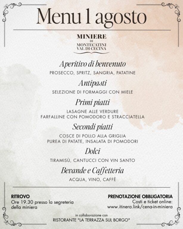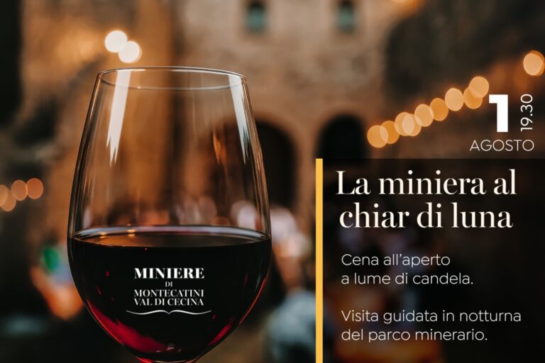 Venerdì 1 agosto appuntamento da non perdere per tutti coloro che desiderano visitare ed approfondire la conoscenza dell’antica miniera di rame di Montecatini Val di Cecina: una cena a cielo aperto negli spazi delle antiche laverie del complesso minerario ed a seguire visita guidata delle antiche gallerie, del pozzo Alfredo degli ex uffici della direzione.