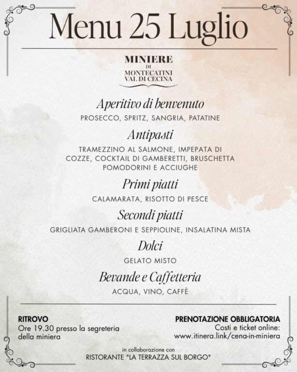 Il 25 luglio ore 19.30 appuntamento da non perdere, promosso da coop. Itinera in collaborazione con il Comune di Montecatini Val di Cecina, per tutti coloro che desiderano visitare ed approfondire la conoscenza dell’antica miniera di rame di Montecatini Val di Cecina. Tutti i venerdì dal 4 luglio al 29 agosto (escluso l’11 luglio) si svolgono le cene in miniera in collaborazione con il ristorante “La Terrazza sul borgo” del paese ed a seguire le visite guidate in notturna. Le serate rappresentano un’occasione da non perdere per tutti coloro che vogliono conoscere curiosità ed aneddoti di questa suggestiva area archeologica situata a circa un chilometro dal centro abitato.
