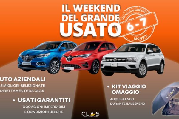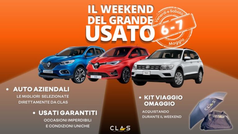 Fine settimana all’insegna dell’usato da Clas concessionaria Renault e Dacia (con sede a Pisa, Livorno e Cecina) dove per il weekend 6-7 Maggio sarà possibile acquistare auto d’occasione a prezzi super vantaggiosi. Recandovi presso le concessionarie CLAS potrete trovare un’ampia gamma di veicoli usati e modelli Km0, l’auto che più si abbina alle vostre esigenze. A tutti coloro che acquisteranno la loro auto in questo weekend in omaggio un utilissimo Kit Viaggio composto da trolley e ombrello targati CLAS. L’estate è alle porte e quale migliore occasione di affrontare le vostre vacanze se non a bordo di una nuova auto con al vostro fianco il nostro Kit Viaggio?