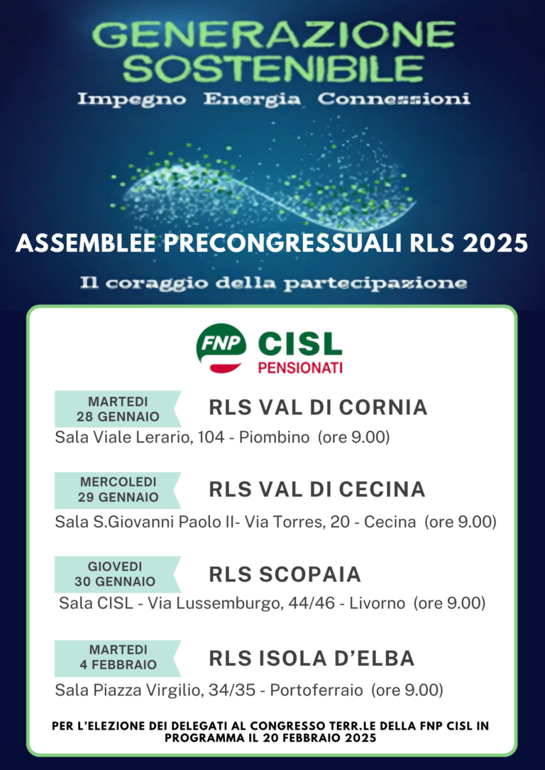 FNP Cisl Pensionati invita a partecipare alle assemblee precongressuali RLS 2025 per l’elezione dei delegati al congresso territoriale della FNP Cisl in programma il 20 Febbraio 2025. Il calendario delle assemblee è il seguente: