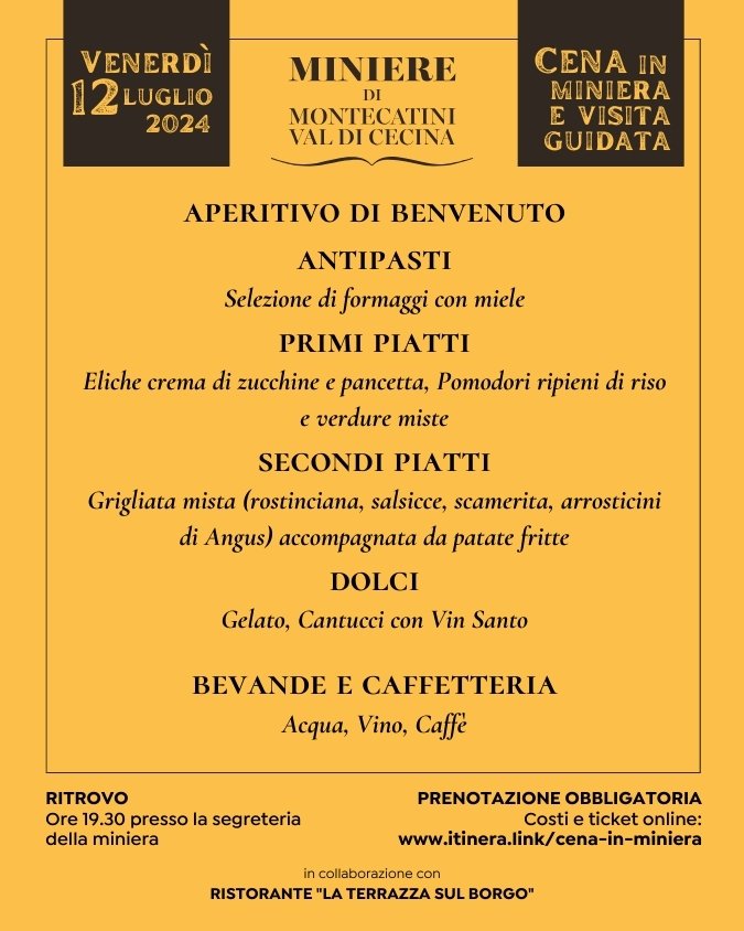 i della miniera verranno organizzate cene a base di ricette tipiche toscane in collaborazione con il ristorante “La terrazza sul borgo” a cui seguiranno percorsi di visita guidata con operatori esperti della cooperativa Itinera. La miniera di Montecatini Val di Cecina è un’antica miniera di rame situata a circa un km dal centro storico. Rimasta attiva fino al 1907 è stata nel corso del XIX secolo la più grande miniera di rame d’Europa. Qui è nata la società Montecatini, una delle maggiori industrie europee, confluita poi nella celebre Montedison. Per i visitatori è l’occasione di un affascinante viaggio per conoscere le tecniche di estrazione e le storie dei minatori. Oggi il visitatore può ammirare le strutture ottocentesche legate all’estrazione, le ex Laverie, parte delle gallerie percorribili a piedi, gli ex uffici della Direzione.