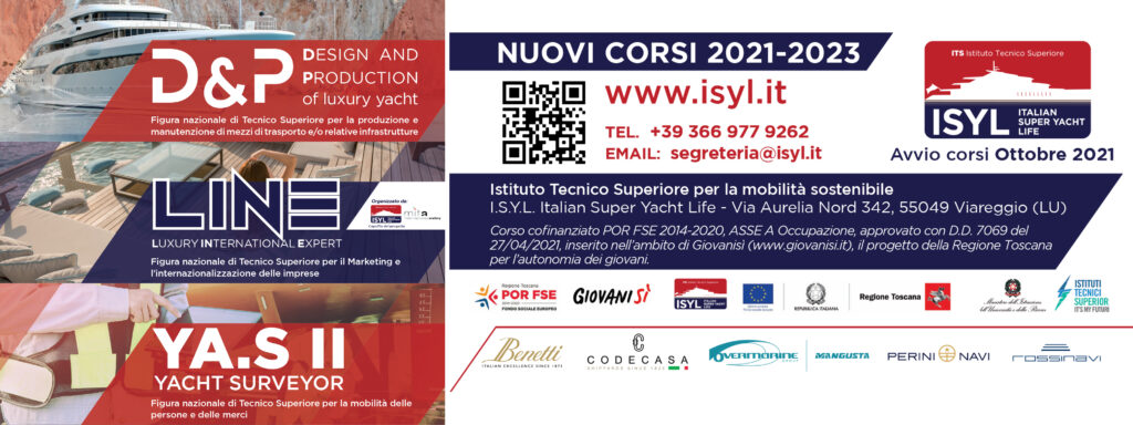 Seconda edizione, per il corso YA.S YACHTING SURVEYOR (Tecnico superiore per la mobilità delle persone e delle merci). Con durata biennale, è dedicato a 25 diplomati/laureati dell’età massima di 30 anni (non compiuti), che aspirano a diventare surveyor, tecnici altamente qualificati in grado di ispezionare lo yacht ed i suoi impianti. Il surveyor sia di bordo che a terra è una figura professionale importante fin dal momento della costruzione dell’imbarcazione e per tutto il ciclo di vita dello yacht che si interfaccia sia con il cantiere, con ispettori di bandiera, enti di classificazione e registri navali oltre che comandanti e in alcuni casi armatori. Il corso prevede 4 Semestri per un totale di 2000 ore di cui 800 di stage. Le domande dovranno pervenire entro venerdì 15 ottobre 2021.