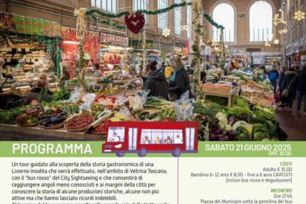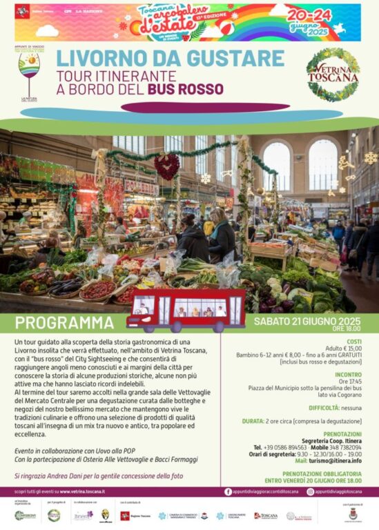 In occasione di Arcobaleno d’estate Confesercenti provinciale di Livorno nell’ambito di Vetrina Toscana in collaborazione con Coop. Itinera, promuove per sabato 21 giugno un evento imperdibile. Un tour guidato alla scoperta della storia gastronomica di una Livorno insolita che verrà effettuato, con il “bus rosso” del City Sightseeing che consentirà di raggiungere angoli meno conosciuti e ai margini della città per conoscere la storia di alcune produzioni storiche, alcune non più attive ma che hanno lasciato ricordi indelebili. Al termine del tour saremo accolti nella grande sala delle Vettovaglie del Mercato Centrale per una degustazione curata dalle botteghe e negozi del nostro bellissimo mercato che mantengono vive le tradizioni culinarie e offrono una selezione di prodotti di qualità toscani all’insegna di un mix tra nuovo e antico, tra popolare ed eccellenza con la partecipazione di Osteria Alle Vettovaglie e Bacci Formaggi.