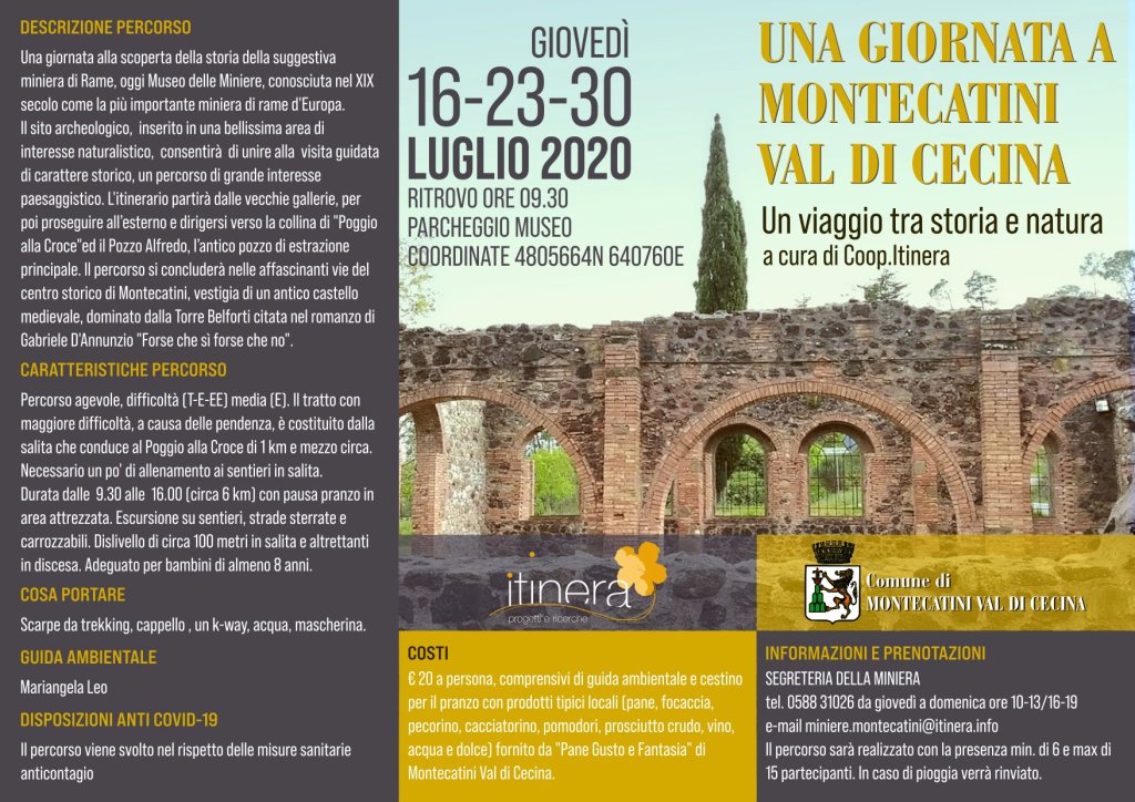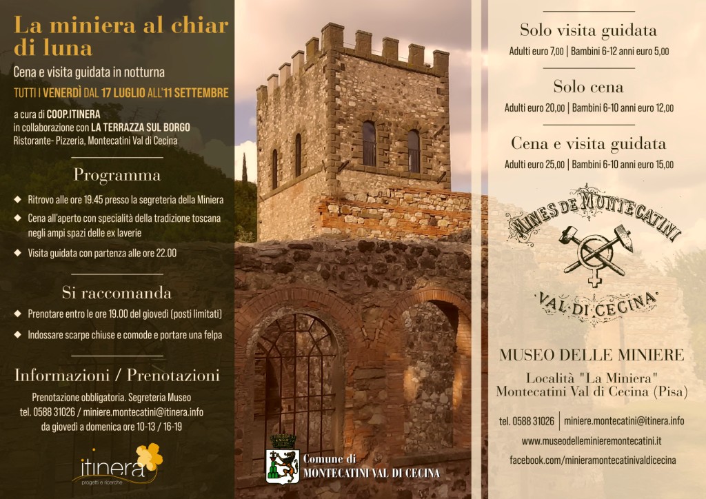 Per tutti coloro che desiderano visitare e approfondire la conoscenza dell’antica miniera di rame di Montecatini Val di Cecina (Pisa), e dell’area del borgo medievale omonimo, ecco alcune iniziative da non perdere promosse da coop.Itinera in collaborazione con il Comune di Montecatini Val di Cecina. Due i calendari di iniziative culturali che si svolgeranno tra luglio, agosto e settembre: “Una giornata a Montecatini Val di Cecina tra storia e natura” e “La miniera al chiar di luna” (nelle foto i programmi da scaricare con le informazioni).