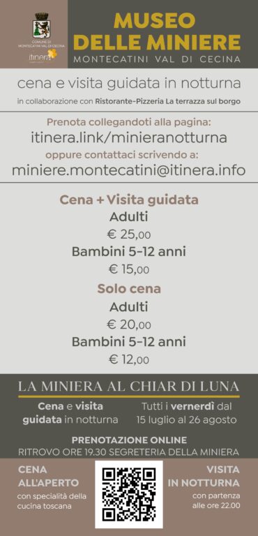 Per tutti coloro che desiderano visitare ed approfondire la conoscenza dell’antica miniera di rame di Montecatini Val di Cecina ecco alcune serate da non perdere promosse da coop.Itinera in collaborazione con il Comune di Montecatini Val di Cecina. Tutti i venerdì dal 15 luglio al 26 agosto si svolgono le cene in miniera in collaborazione con il ristorante “LA TERRAZZA SUL BORGO” del paese ed a seguire le visite guidate in notturna. Le serate rappresentano un’occasione da non perdere per tutti coloro che vogliono conoscere curiosità ed aneddoti di questa suggestiva area archeologica situata a circa un chilometro dal centro abitato. Si ricorda che la storia del bellissimo borgo di medievale di Montecatini Val di Cecina è legata alla Miniera di rame rimasta attiva fino al 1907 e che, tappa storica nel campo dell’estrazione del rame. Dell’intero complesso minerario, che risale all’epoca etrusca, sono visitabili parti delle gallerie ottocentesche (il reticolo delle gallerie in origine si estendeva in origine per circa 35 Km fino ad una profondità di 315 m.), la torre di Pozzo Alfredo con il montacarichi “sospeso sulle teste dei visitatori”, gli ex uffici della Direzione, il laboratorio per le analisi chimiche. Prossimo appuntamento venerdì 29 luglio, in allegato il menù della serata.