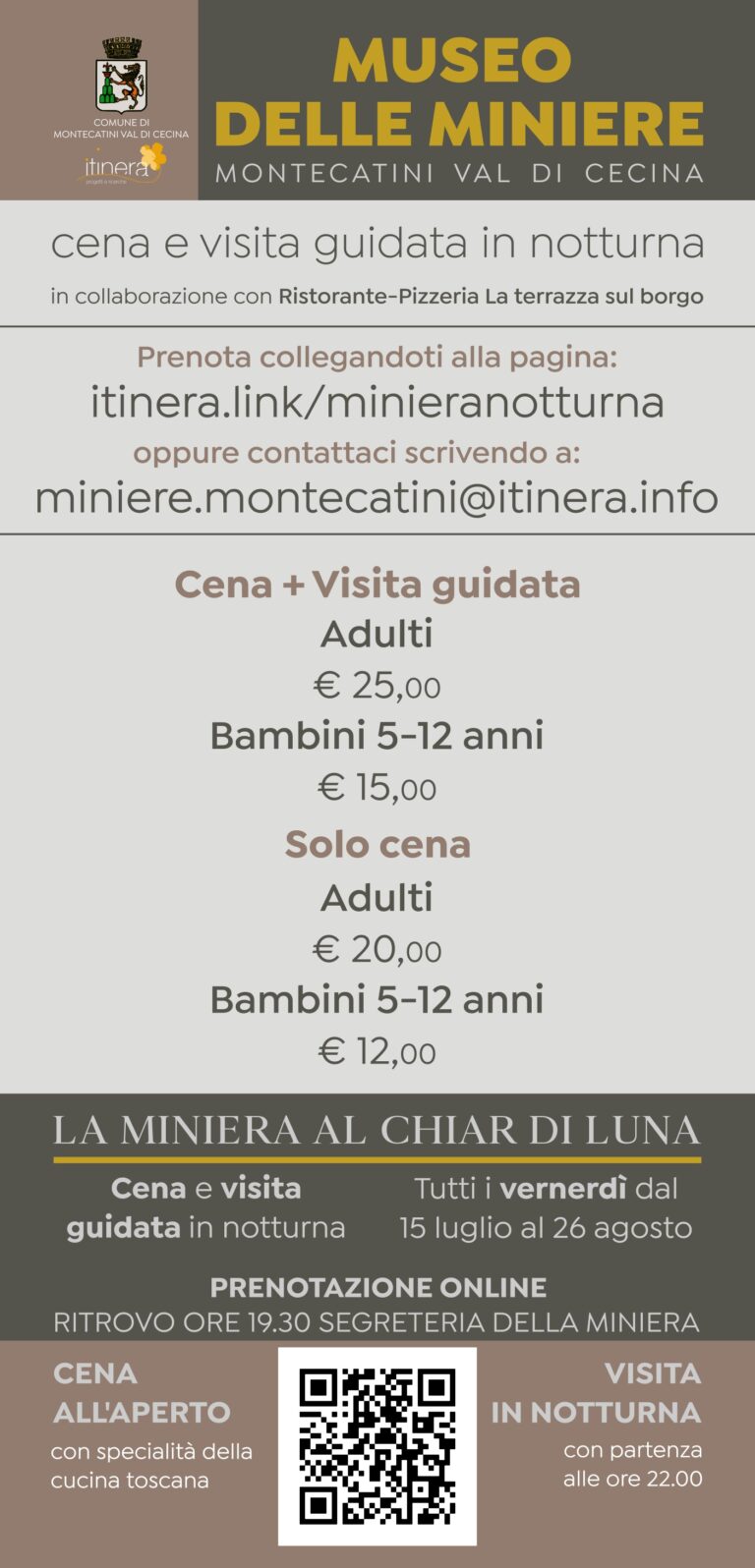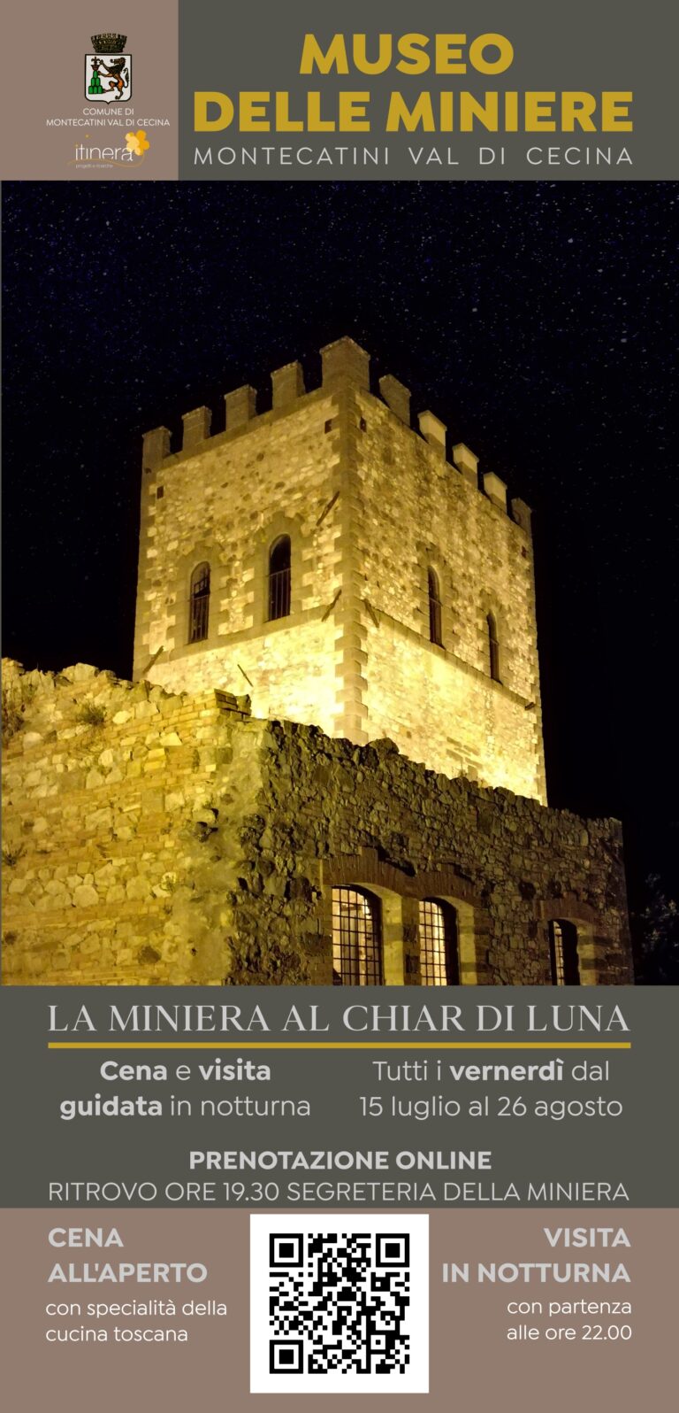 Tutti i venerdì fino al 26 agosto cene in miniera e visita guidata in notturna. Prenotazione obbligatoria. Acquisto dei biglietti online sul sito www.museodelleminieremontecatini.it